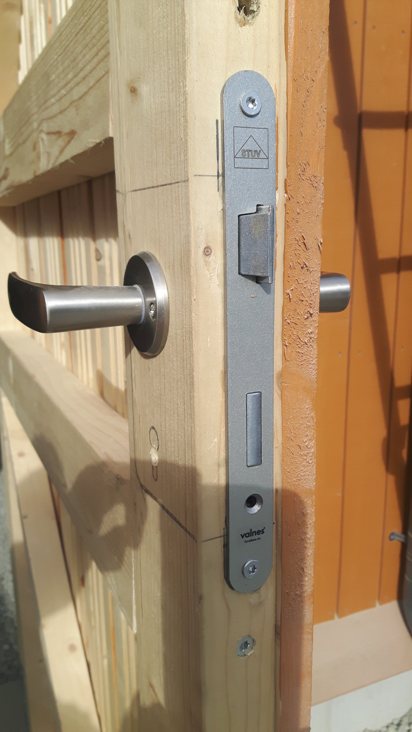 Vaja ehitada ukseraam 45x95 prussist/liimuidust. Sisse süvistada lukukorkusele ava. Raami välismõõtmed 910x2000mm. Võiks olla tapitud mitte nurkadega kinnitatud.