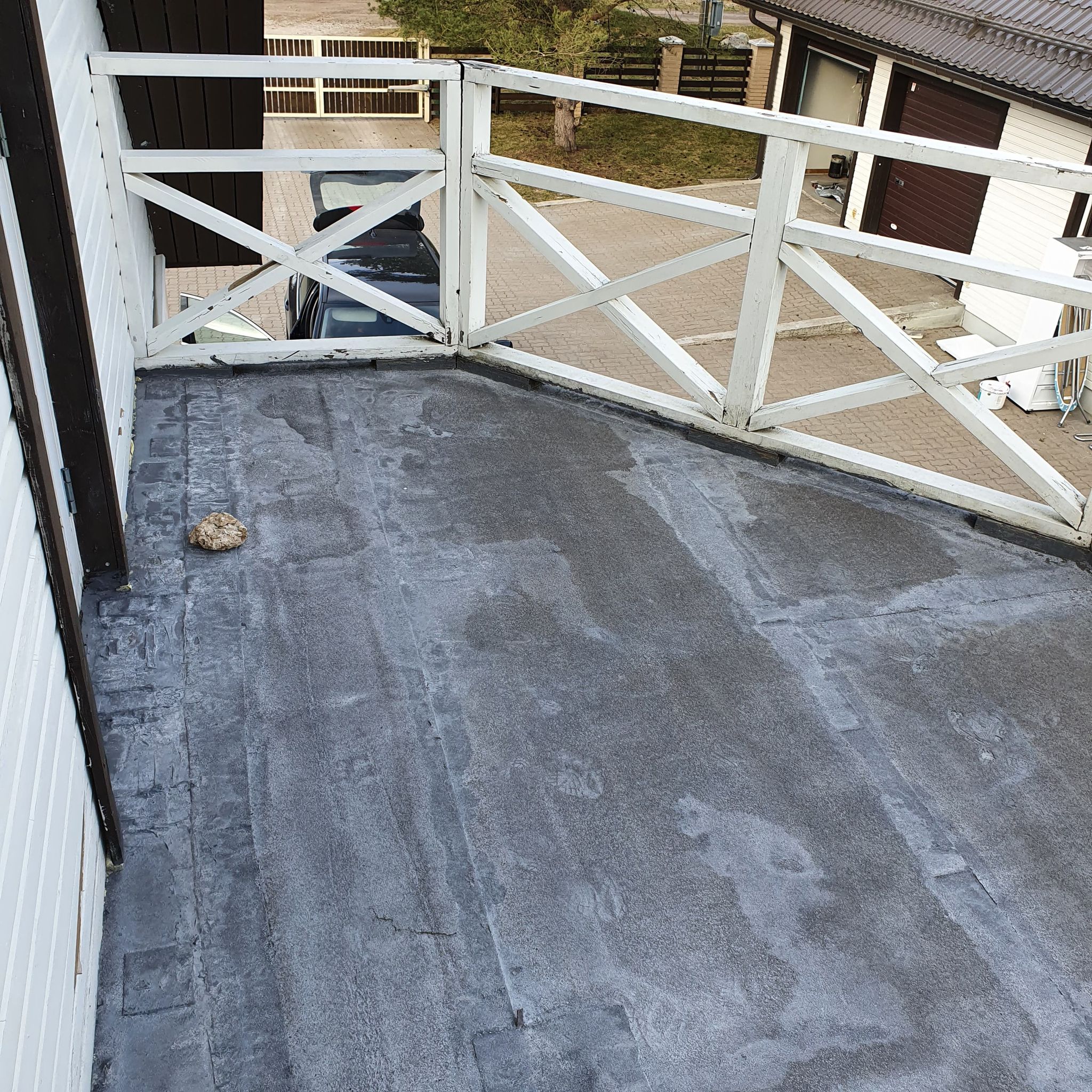 Eramaja rõdu põrand laseb vett läbi esimesele korrusele. Bituumen kate on lapitud ja vana, vesi jääb rõdule seisma ja ei voola ära.