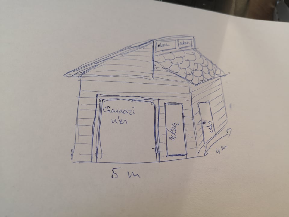 -20m2 hoone (5x4m), millel on garaažiuks, külje peal väike tavaline uks + aken ja aknad üleval katuse all servas (sketch selle paremaks mõistmiseks, mida mõtleme on manuses)