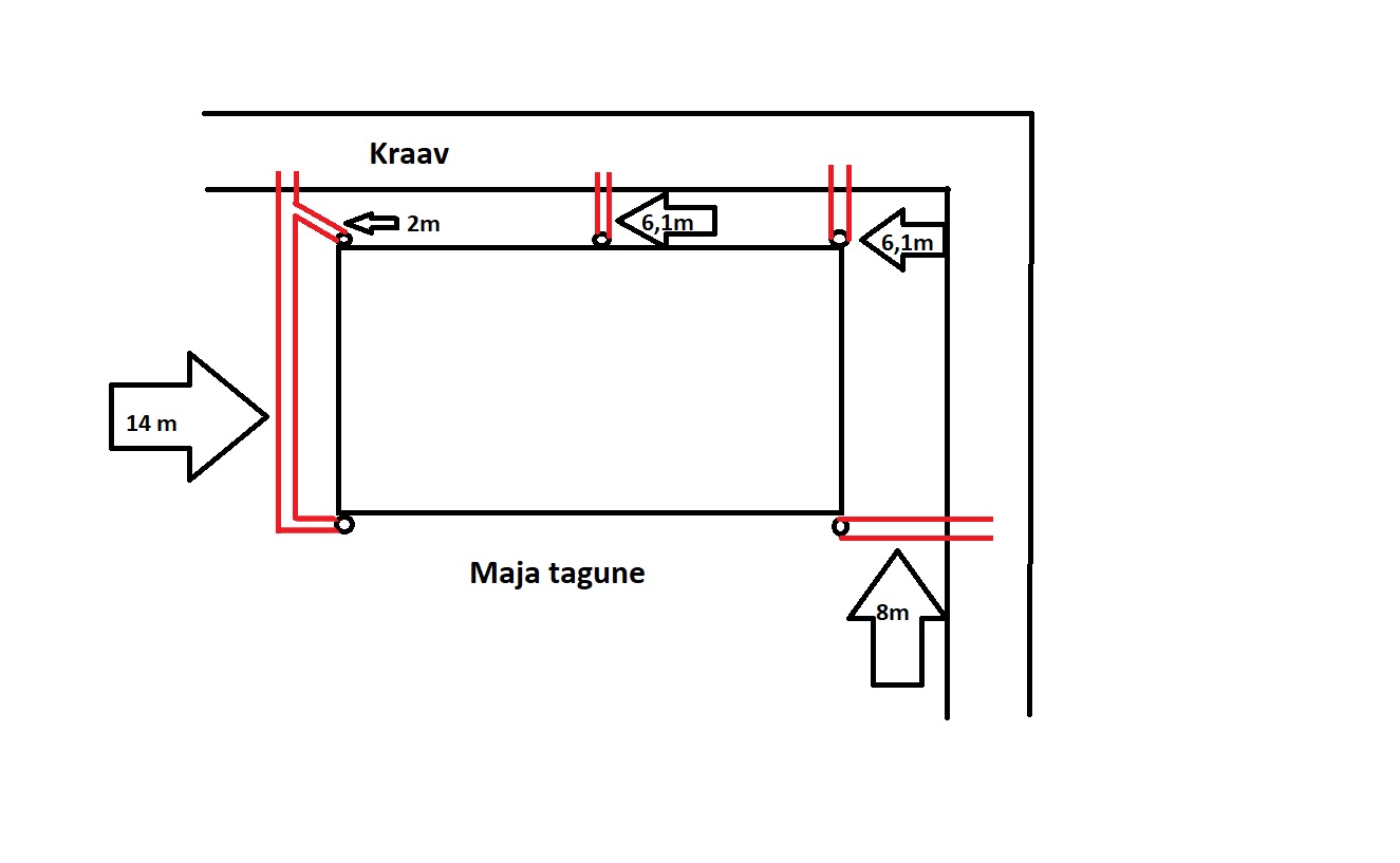Sooviks uuele eramule vihmavee äravoolu rajamist. Majale on 5 vihmaveetoru: 3 ees ja 2 maja taga äärtes. Maja asub tänava lõpus ja piirneb kraavidega eest, ühelt küljelt ja tagant. Vaja oleks kaevata kanalisatsiooni torude jaoks kraavid, killustiku põhi teha ja õige nurga all torud jooksutada kraavidesse ning kinni katta. Lisades on amatöörlikult joonistatud skeem umbkaudsete pikkustega ning paigutustega. Ei soovi teha trenaažitorudega, vaid kanalisatsioonitorudega mida pole vaja eraldi millegiga katta. . Sooviks hinnapakkumist lahtikirjutatuna.