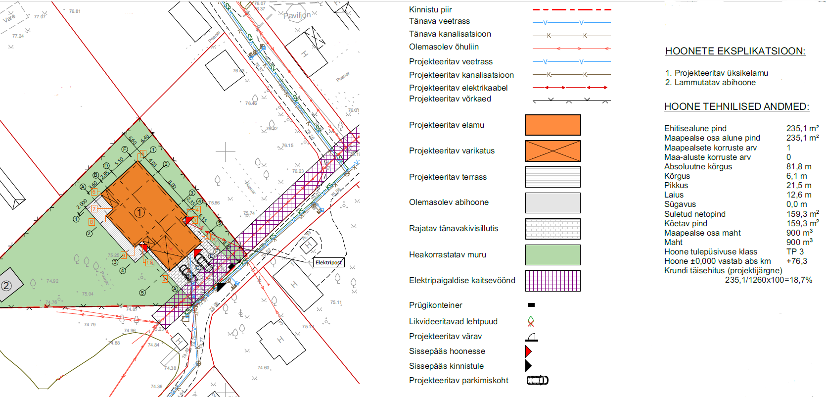 Lisatud väljavõtted asendiplaanist, vundamendi plaanist ning iseloomulikest lõigetest.