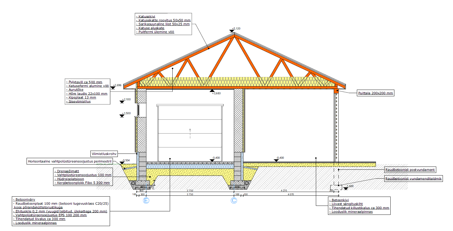 - Vundamendi drenaaži ehitamine vundamendi perimeetrile (sh nurgakaevude paigaldamine ning äravoolu juhtimine läbi põhikaevu (tagasivooluklapiga) kinnistu piiril asuvasse tiiki).