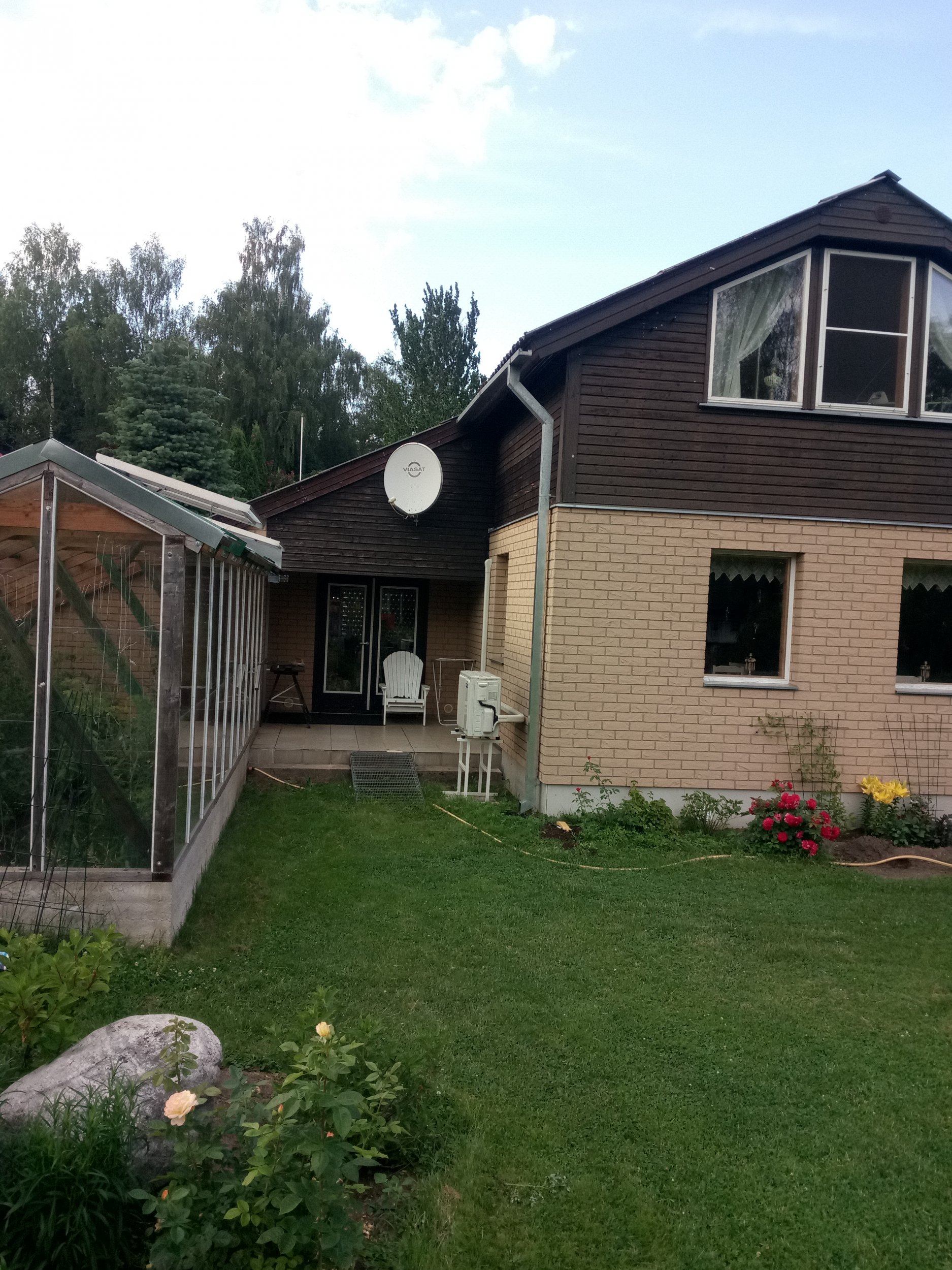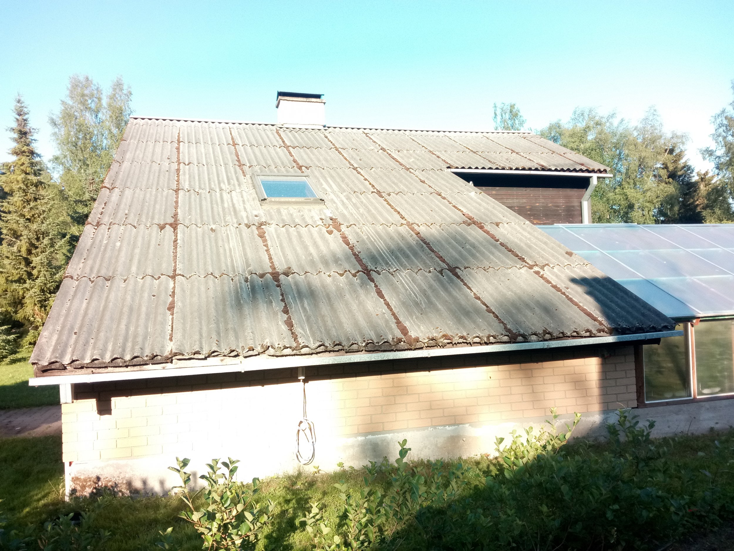 Pesta ca 70m² eterniitkatust, üks maja pool. Katuse kalle 26deg (1:2). Eterniidi peale pestes astuda ei tohi. Tugiredelid olemas.