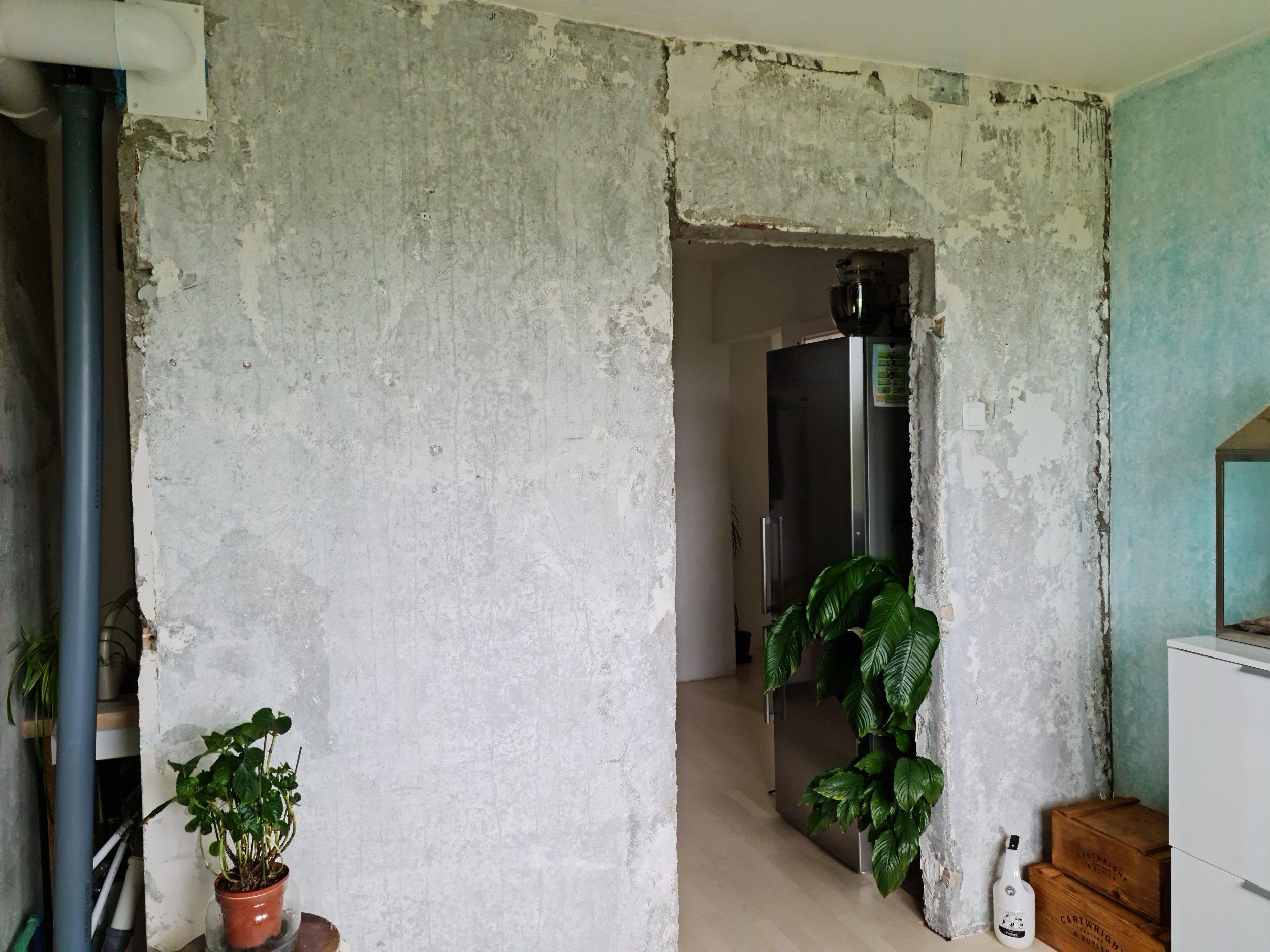 Värvist puhastatud betoonsein (sein 280x255cm, milles ukseava 84x208cm). Seinal on pahtlijäägid, tüüblid, kruvid, seinalüliti jmt. jama. Asukoht Tallinn, Väike-Õismäe paneelmaja 5-s korrus (liftita maja).