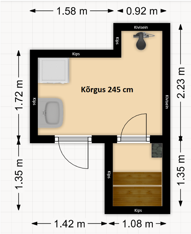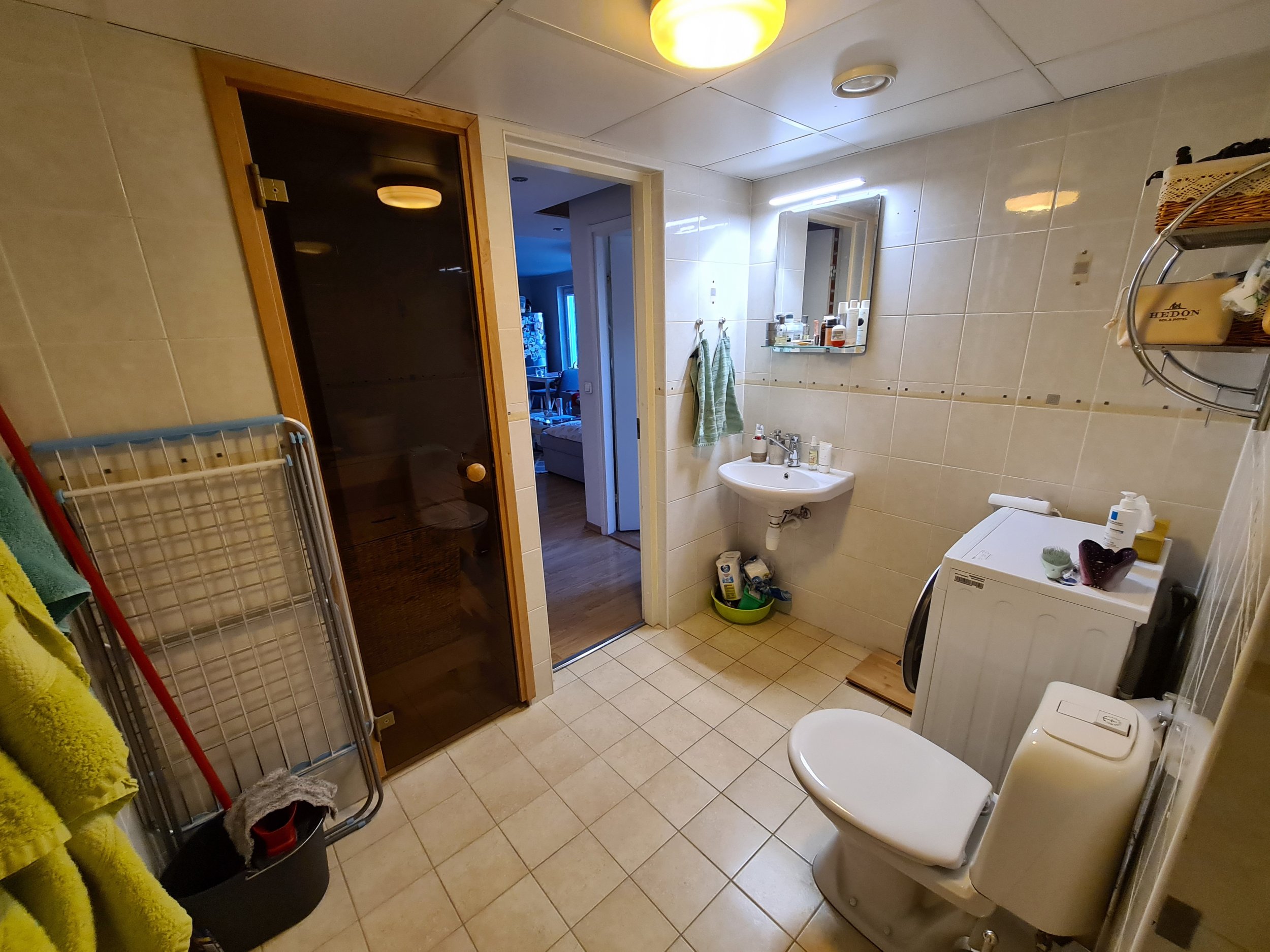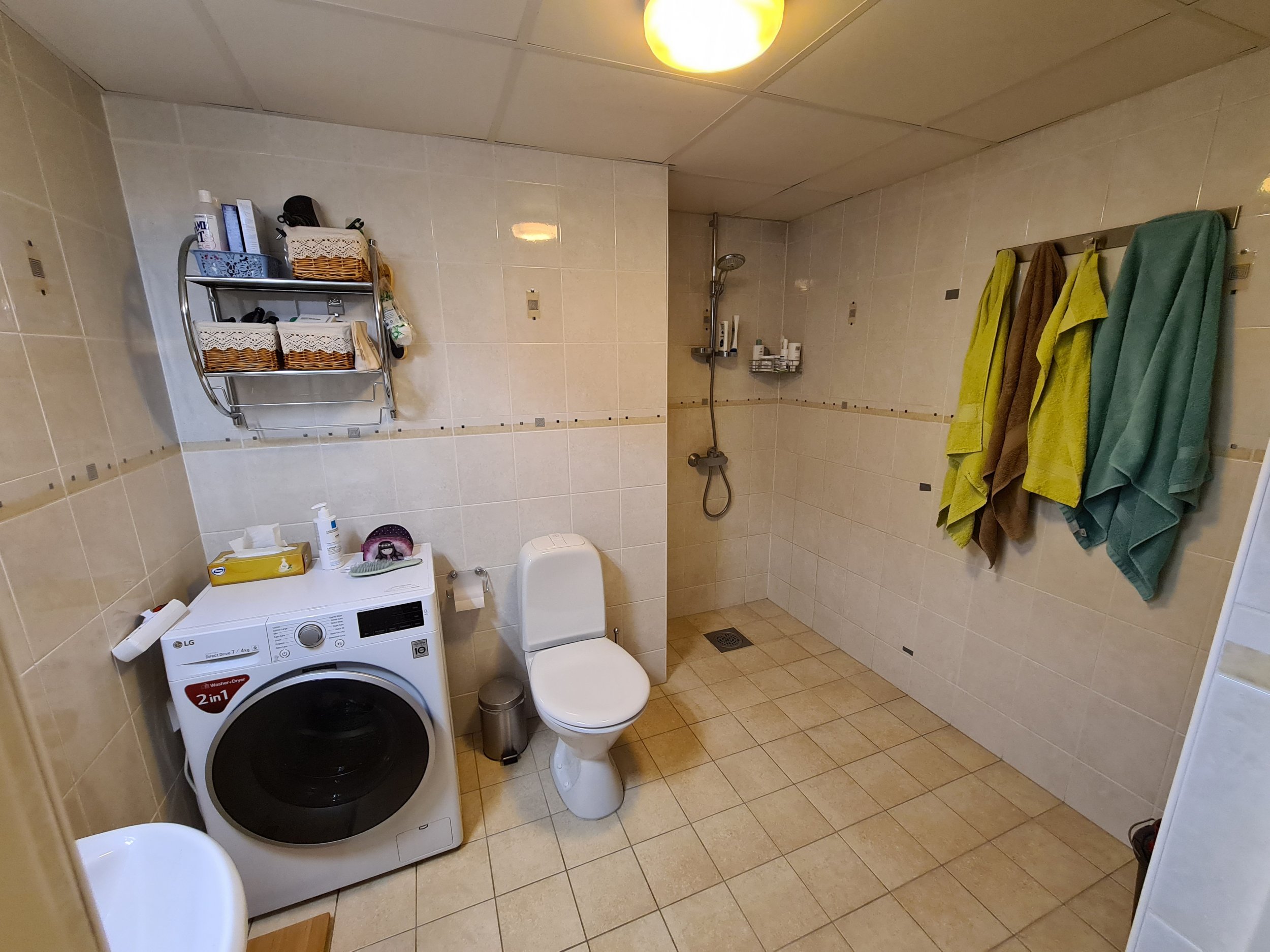 Valamu, WC-poti, duššinurga ja pesumasina koht jääksid samaks. WC pott vahetust ei vajaks. Sauna seintega pole vaja ka midagi teha, seal on plaatide asemel seinas puit. Saunas vajab üle plaatimist vaid põrand.
