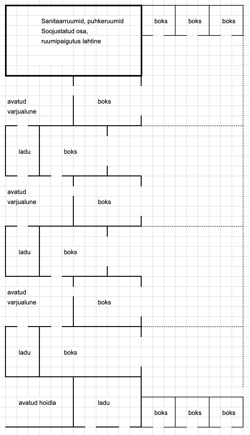 Puitkarkass enamuses soojustamata 12-meetri laiune hoiuruumide ja avatud varjualuste rida. Põhjaplaan lisatud joonisel. Betoonpõrand.