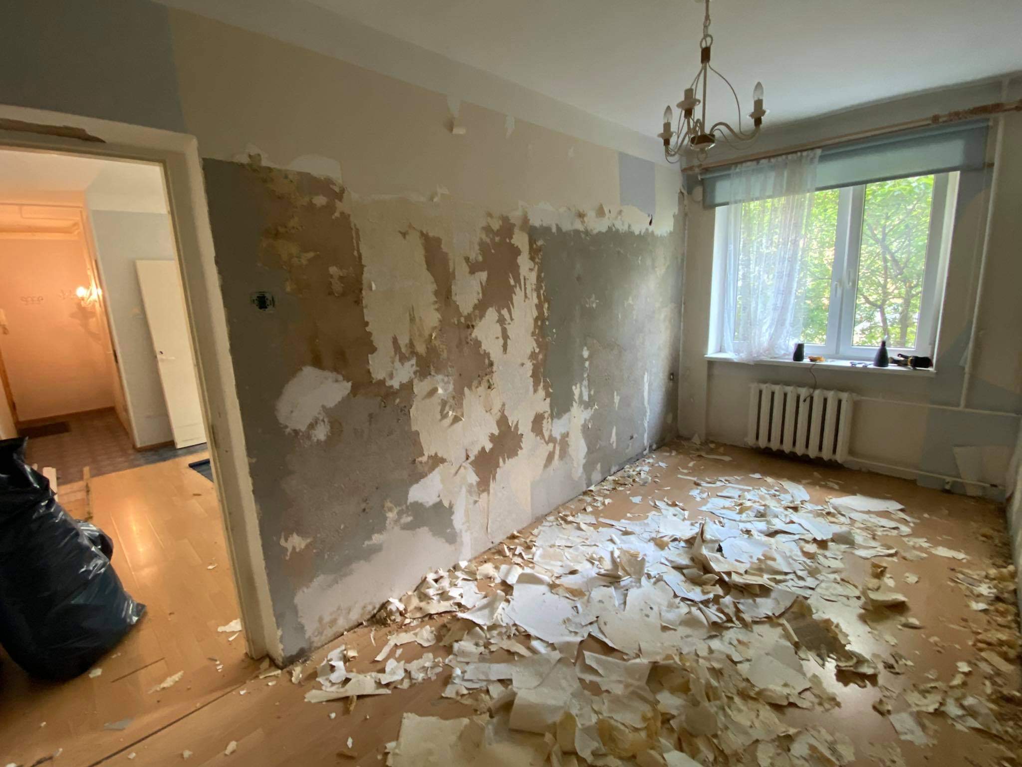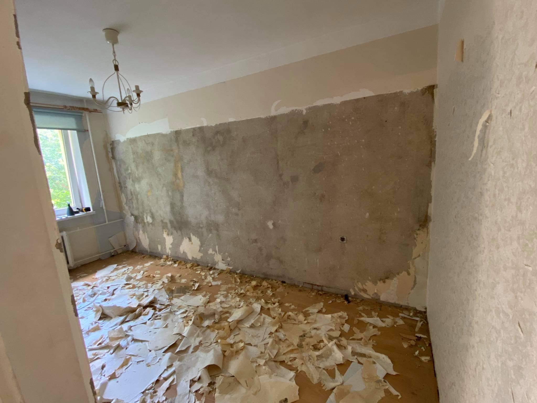 Seintelt tapeet maha võetud, vana laminaat üles võetud.