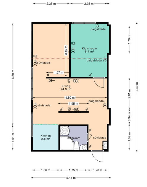 2. Magamistoa ja lastetoa seintes (krohvitud tellis) ja laes (betoon) vana seina (joonisel punane katkendjoon) jälgede tasandamine ja viimistelmine.
