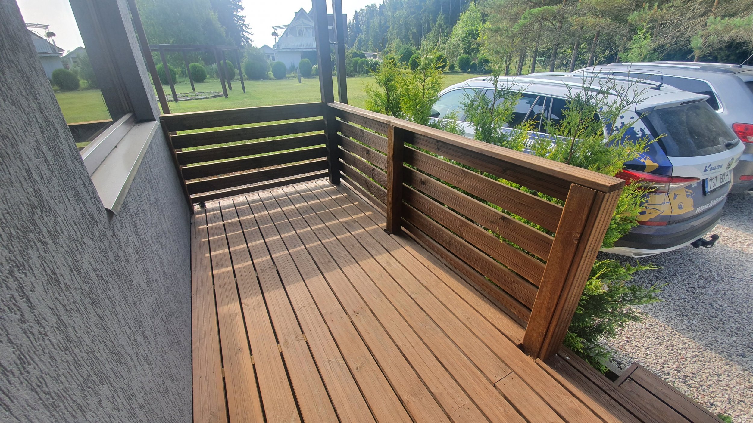 Soovin hinnapakkumist II korruse väliterrassi ehituseks. Sel aastal on terrassi alune kaetud uue OSB plaadiga ning PVC kattega. Vaja oleks katta terrassilauaga (pruun). Ideaalis ajada ka kogu pind rohkem loodi ja ühtlasemaks, kuigi hetkel juba päris sirge. Lisaks tuleb teha piirded. Piirde postid võib kinnitada terrassialast väljapoole katuse ääre külge. Hetkel on sinna paigaldatud ääre peale lühike plekk, aga soov oleks, et enne piirdepostide kinnitamist paigaldataks veel kogu ümbermõõdu ulatuses pikem plekk kitsama alla (Kogu värvimata laua ulatuses), mis katab peaaegu kogu laudise. Lisan pildi, vajadusel seletan täpsemalt. Seejärel alles paigaldada piirdepostid, et plekk jääks sinna alla. Pilt ka alumise korruse terrassipiirdest, milline umbes võiks piire välja näha. Terrassi laiemale osale pleksiklaasist katuse poolsele osale sooviks piiret natukene kõrgemat ja laiemat, mille peale tekiks nn "baarilett", kus saaks vajadusel tooliga piirde ääres istuda ja kohvitopsi toetada. Piirde pealislaua laius võiks olla umbes 40 cm ja võib olla paksem plank. Piirde külge ka metallist jala toetuse koht. Nagu "baarileti" ääres ikka. Üld piirde kõrgus 90 cm. Letiosa piirde kõrgus umbes 115cm. Kogupindala umbes 38 m3. Võib lisada ka soovitusi.
