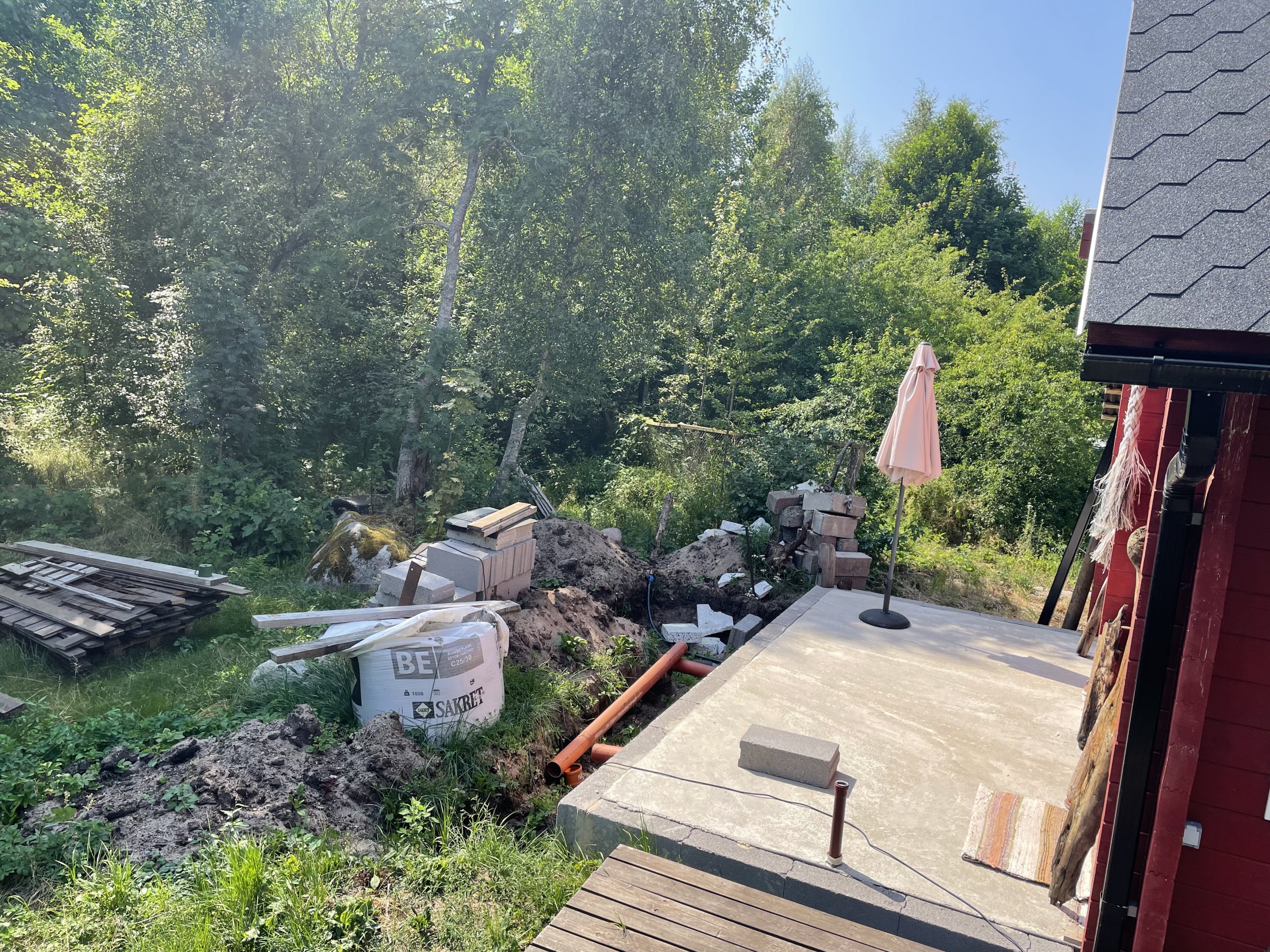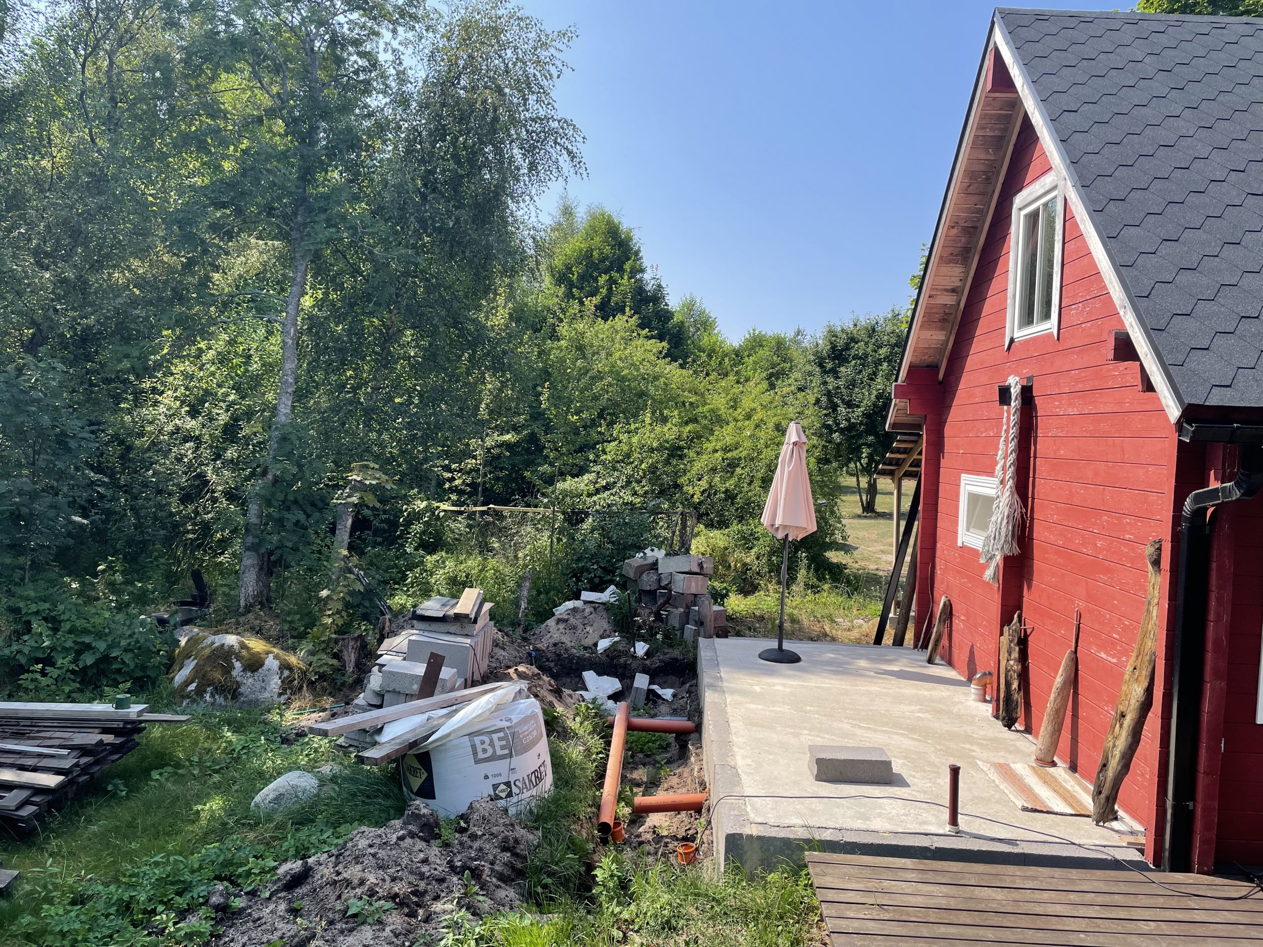 Vundament on osaliselt valmis, plaan siiski veel meetri vôrra pikendada. Seejärel juurdeehituse karkass ja 2.korruse rôdu väljaehitus. Materjalid on osaliselt olemas(fibo, karkassi prussid), jooksvalt on ilmselt vaja juurde soetada, see jääks siis ideaalis ehitaja enda ülesandeks(Viimsist, Leppneemest saab saarele iga päev 3x praamiga üle 1auto+järelkäru). Ööbida saab kohapeal.