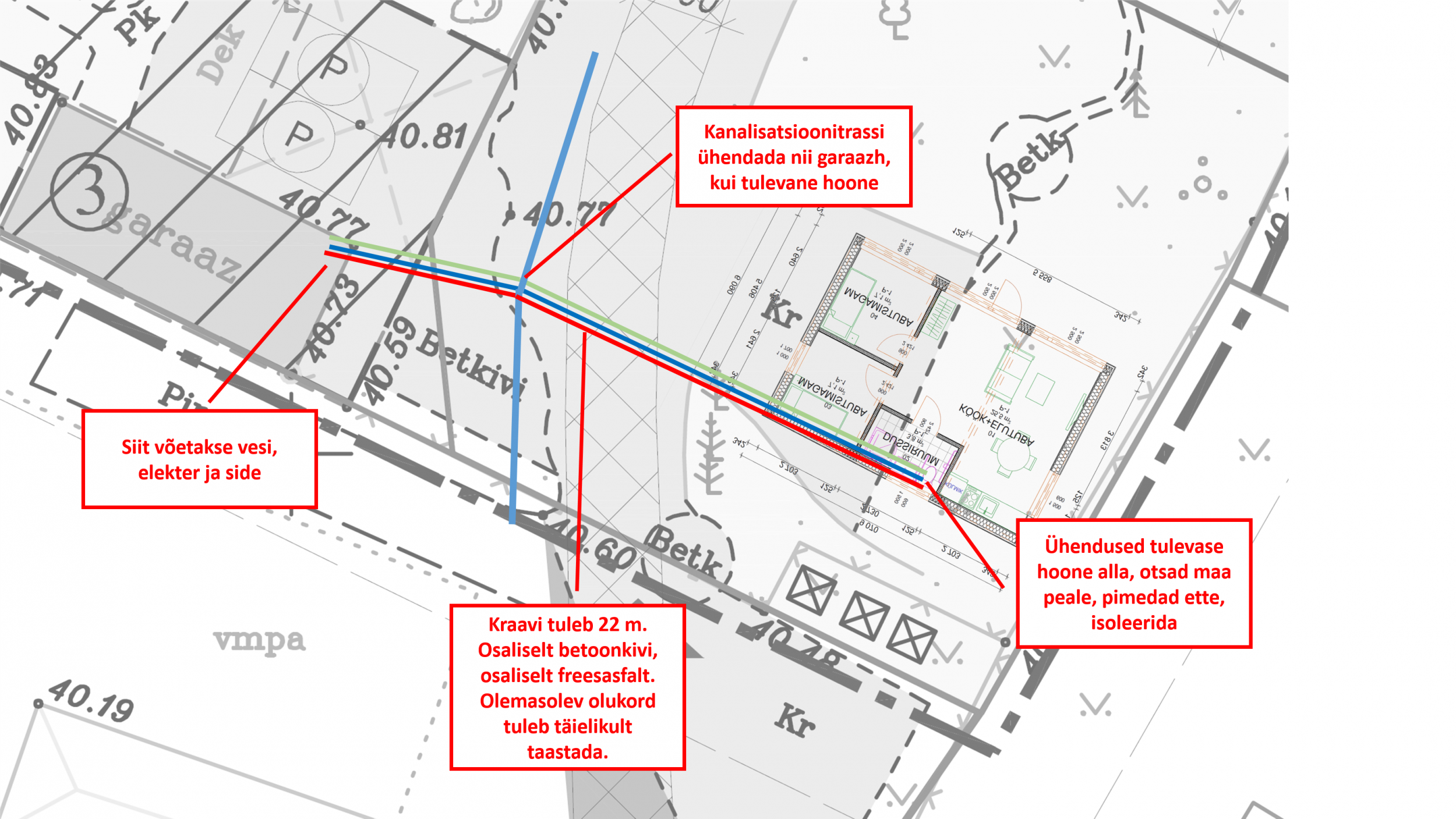 Vaja kaevata 22 m kraav, ühendada 2 punkti kanalisatsioonitrassiga, viia ühest punktist teise veetrass ning elektri- ja sidekaabel. Taastada olemasolev seis - osaliselt betoonkivi, osaliselt freesasfalt. Töö tuleb teha 1-2 päevaga, et naabrite autode liiklust võimalikult vähe häirida.