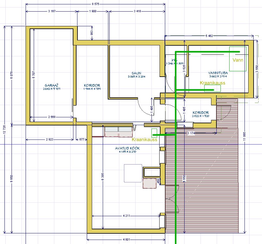 Krundi sisene vee ja kanalisatsiooni torustik ühisveevärgiga liitumiseks. (Piltidel roheline joon)