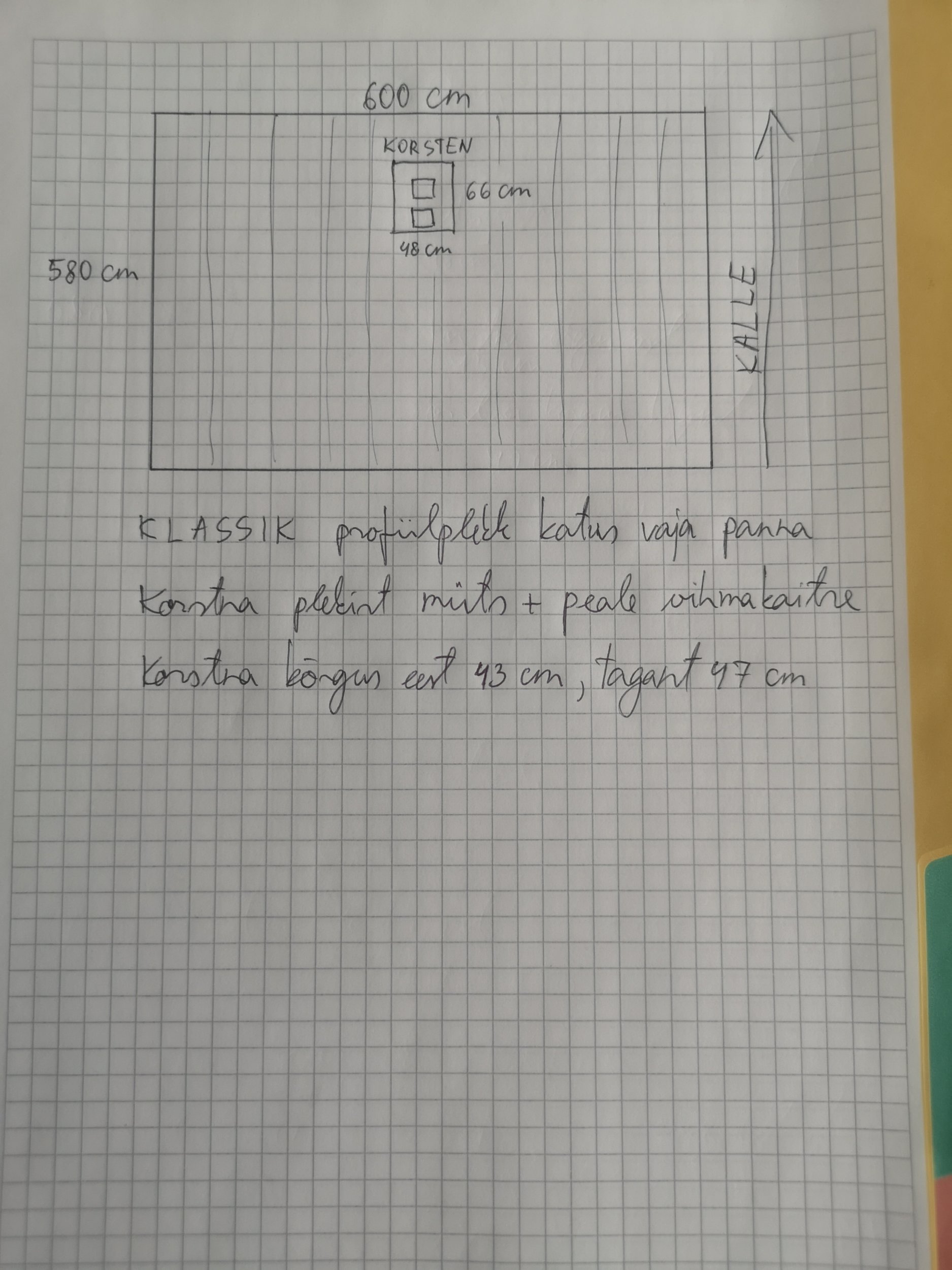 Katus on ristküliku kujuline mõõtudega 580 cm x 600 cm.