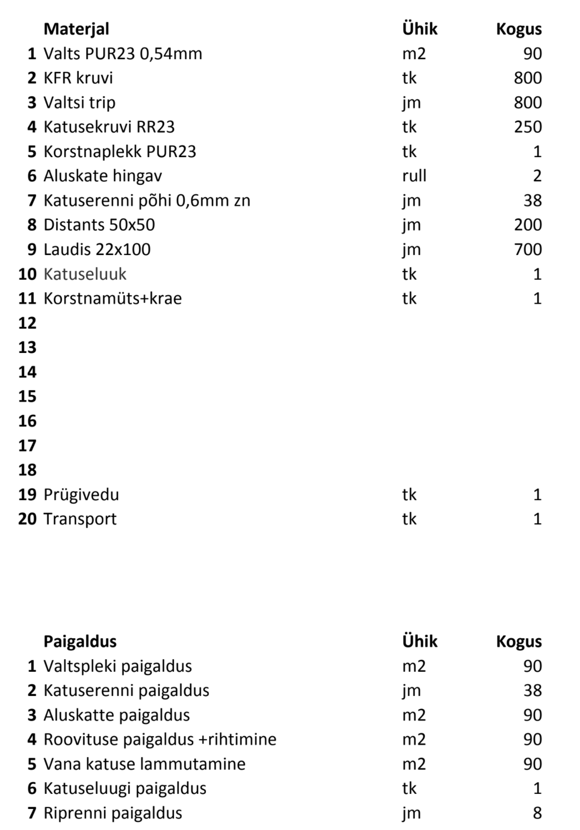 | Ehitusmaterjalid: | Töö tegija poolt |