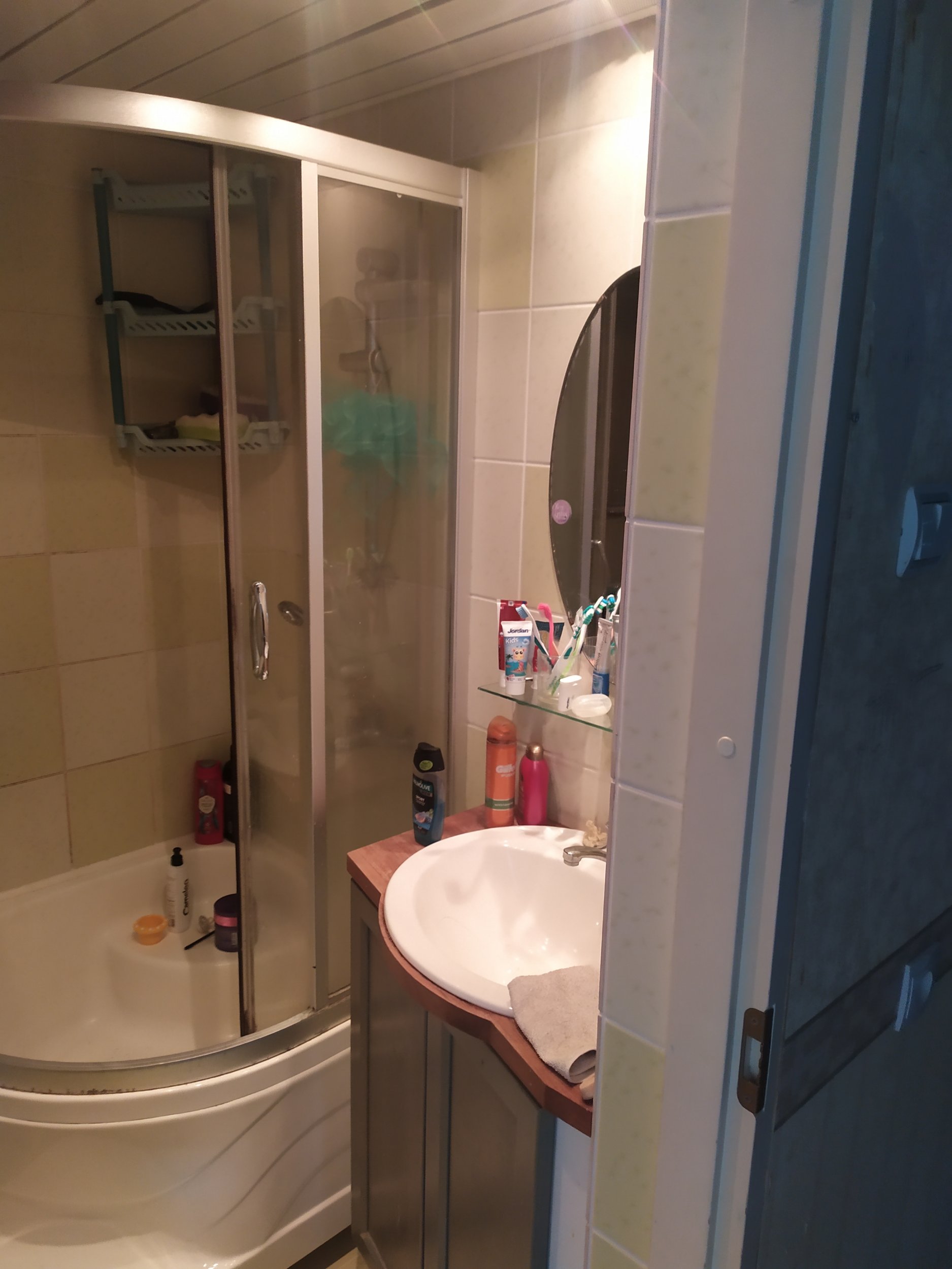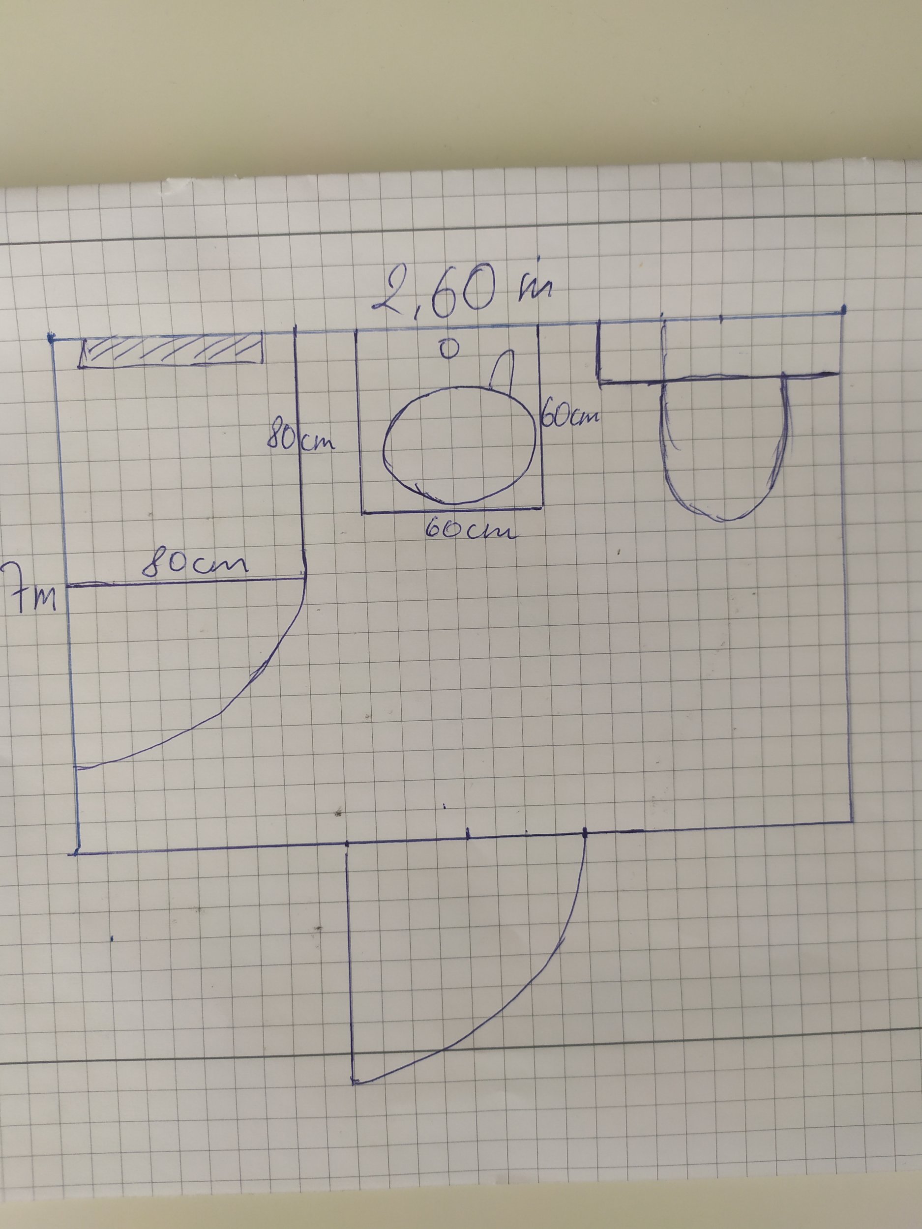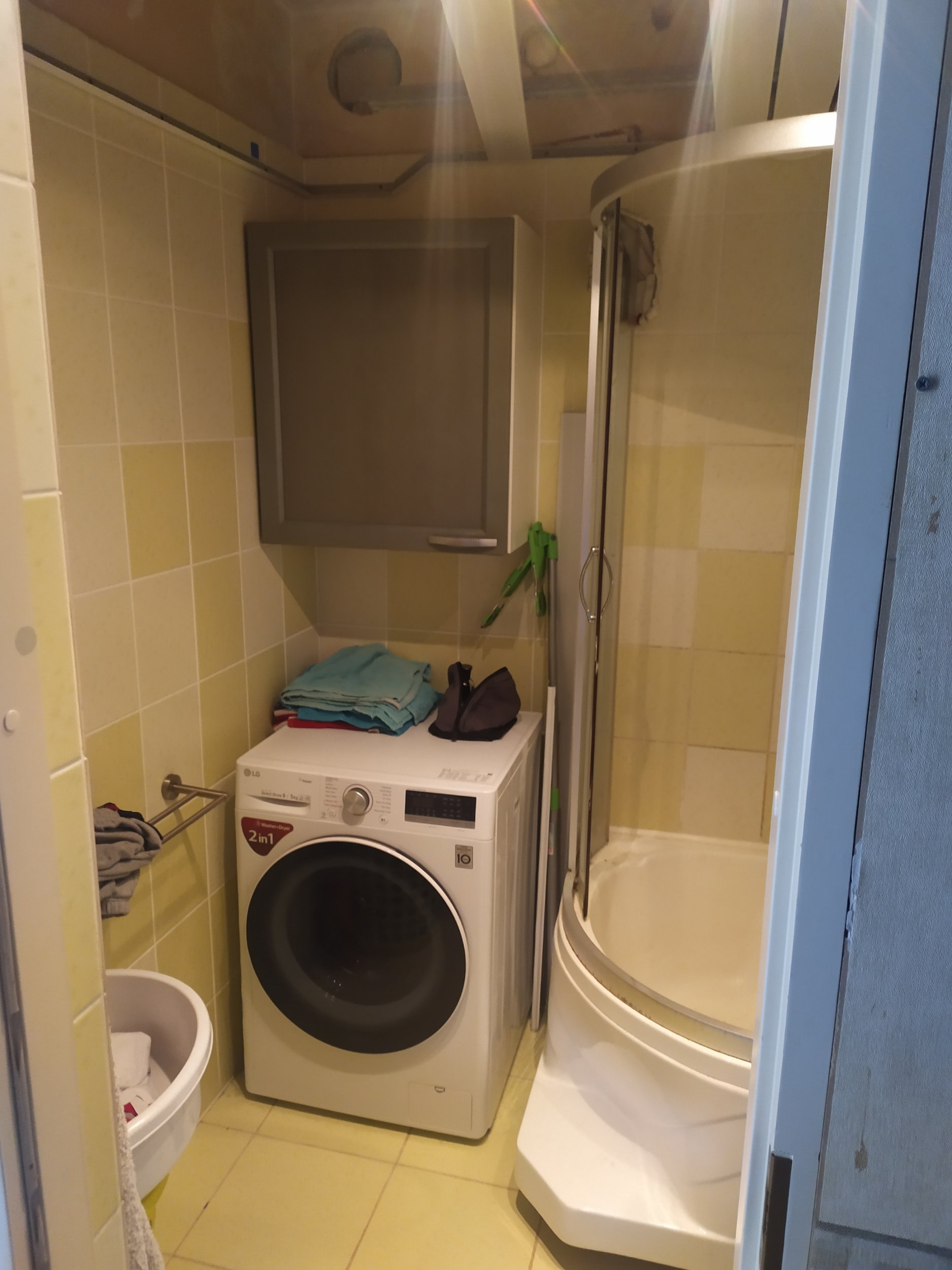 Vasakus nurgas dushinurk klaasist ustega 80cm x 80cm. Äravoolutrapp tuleb seina äärde.