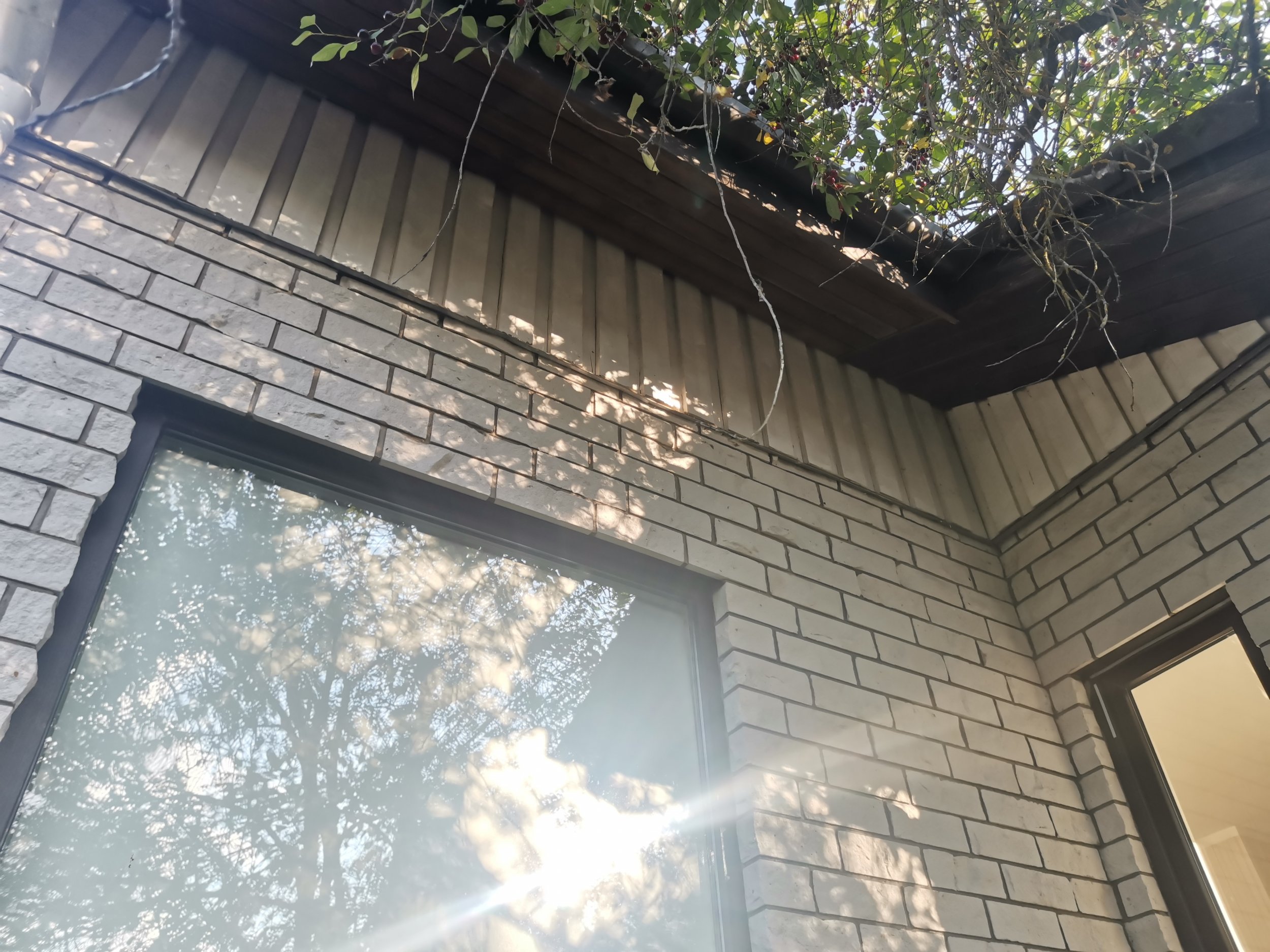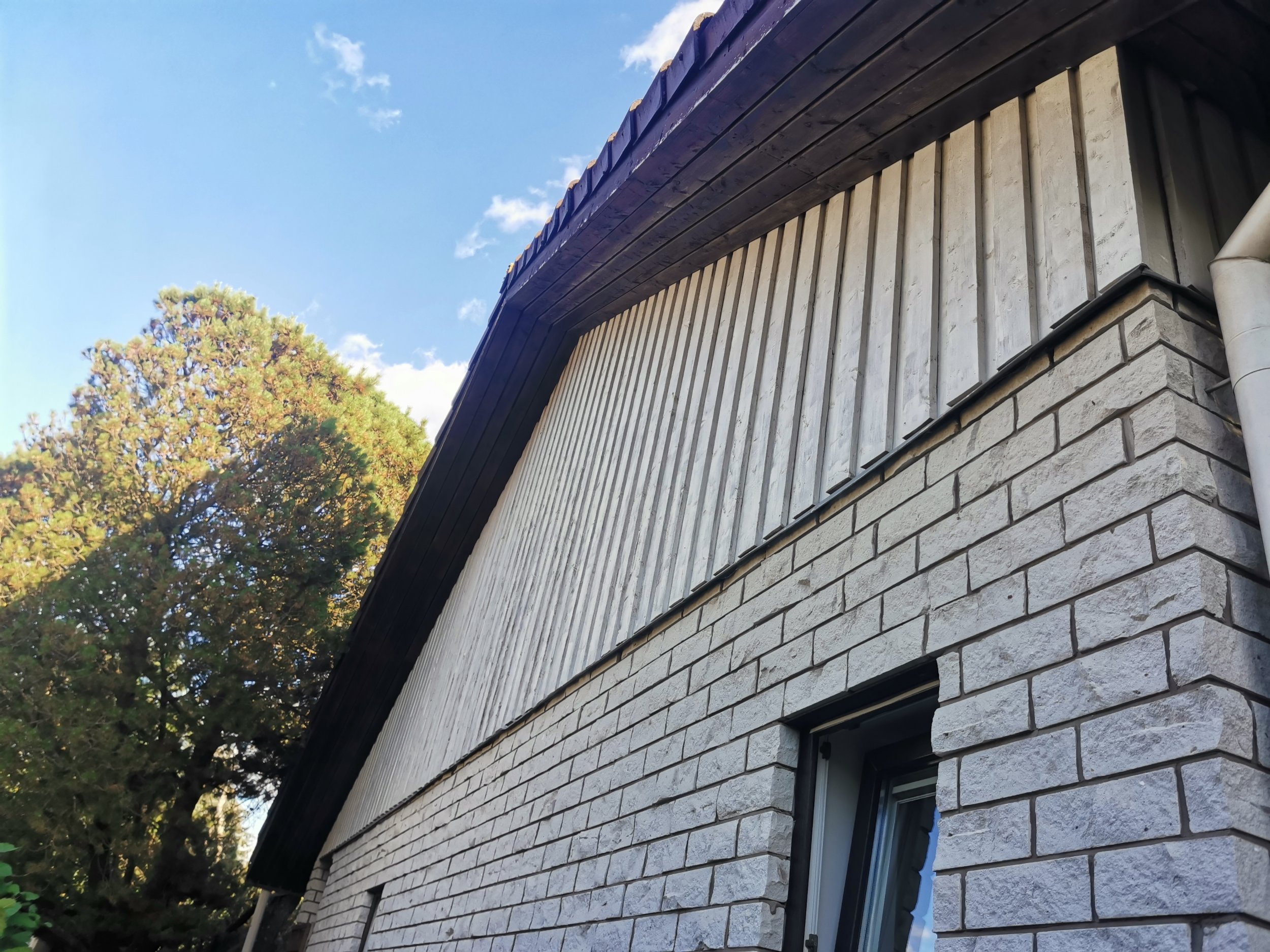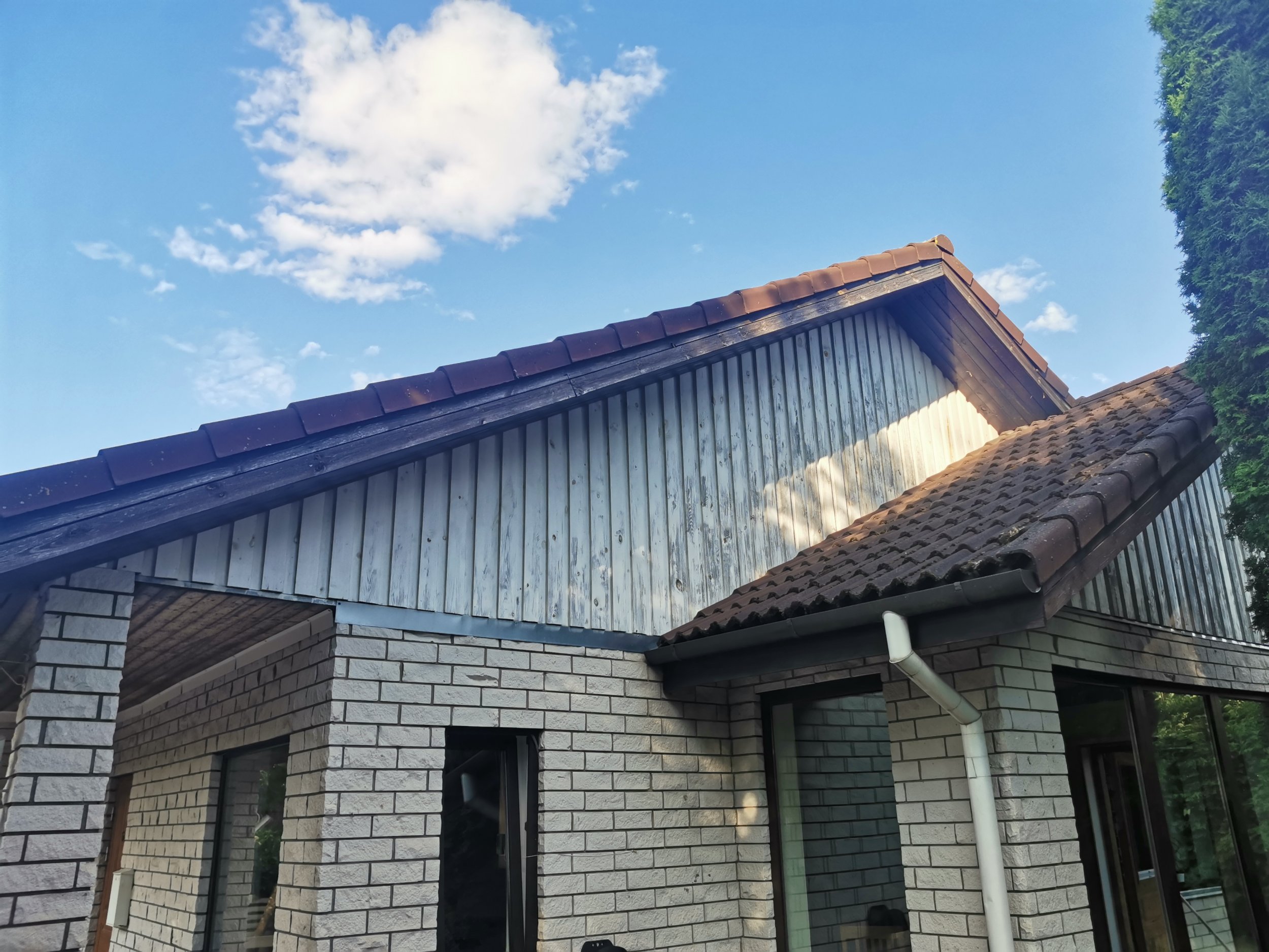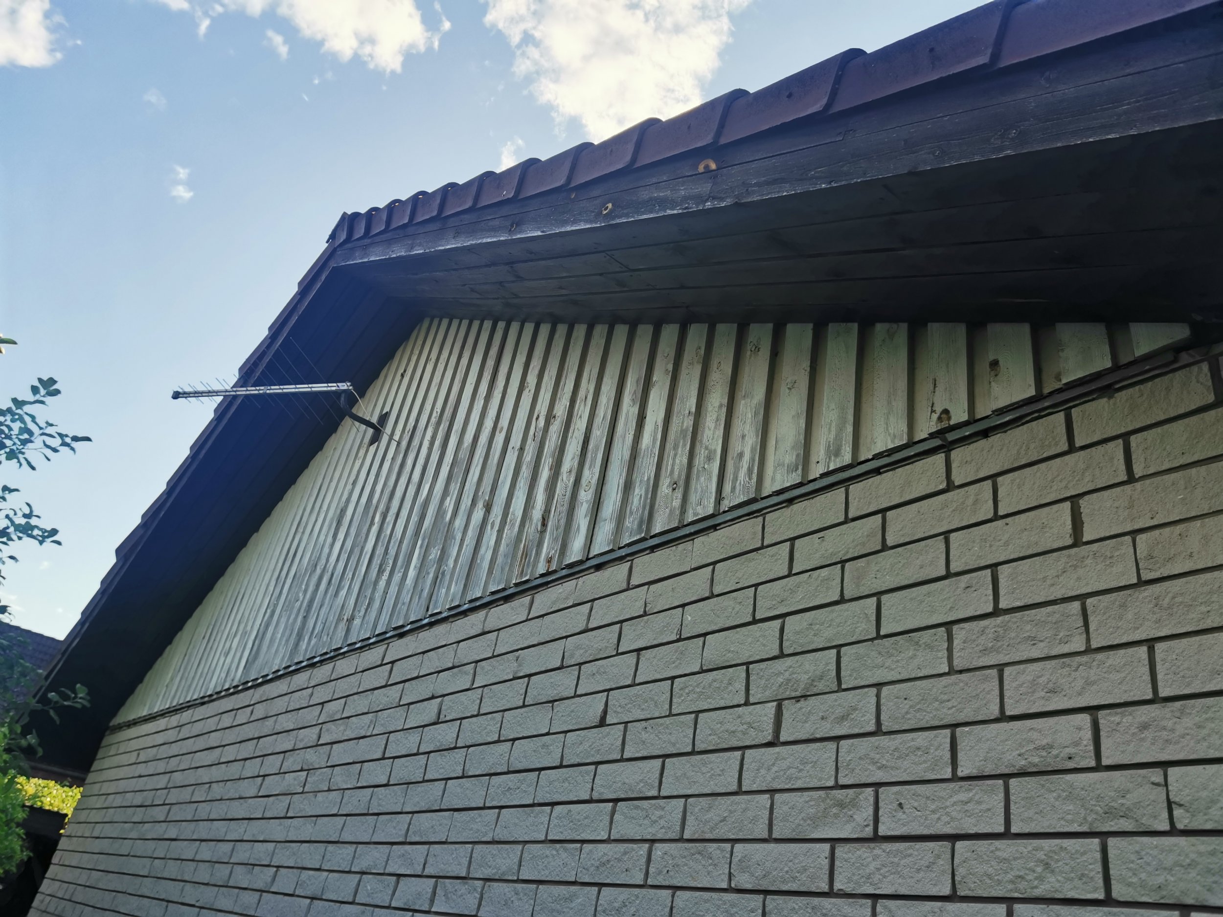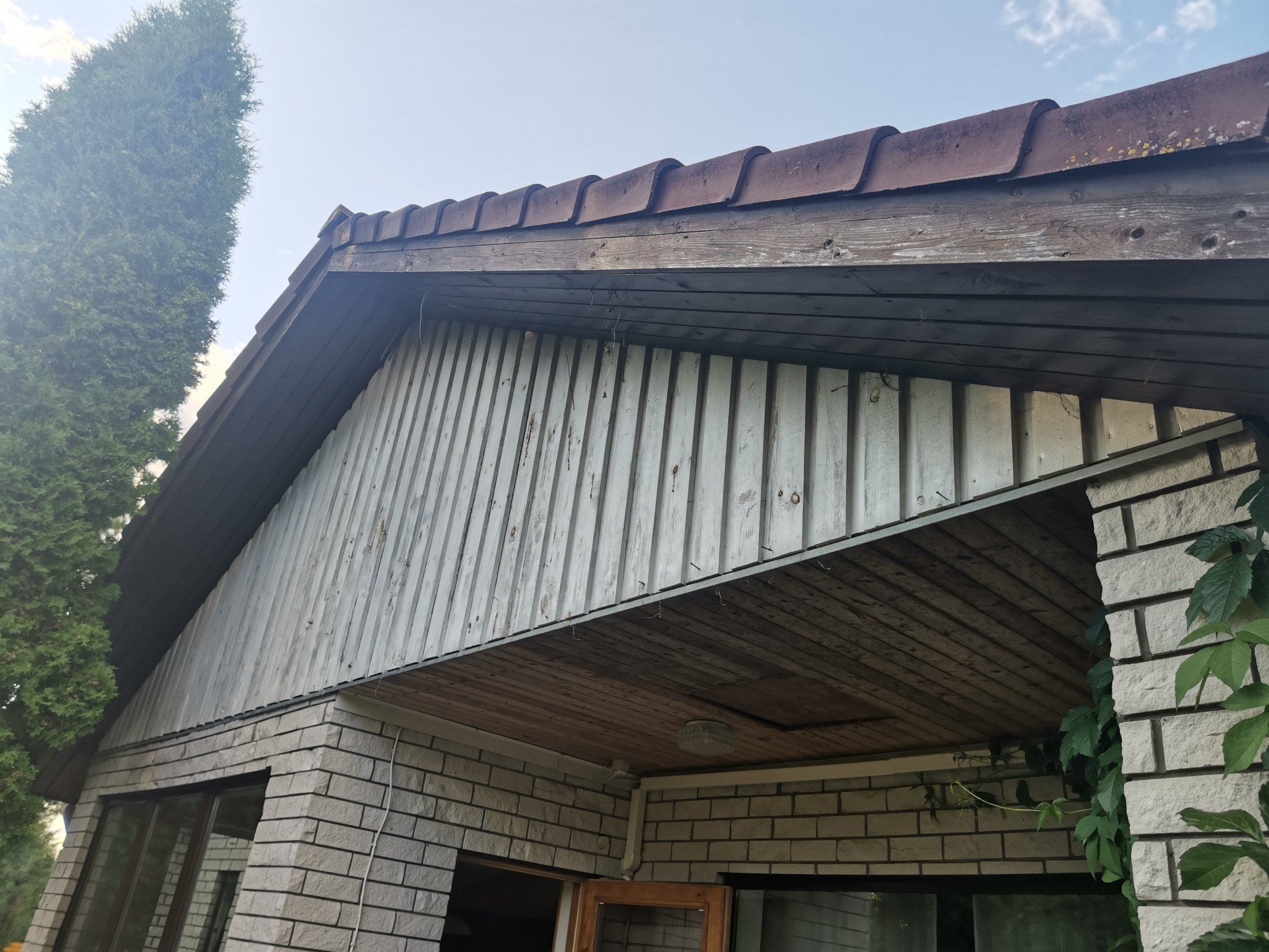 Viilkatusega maja viilu otstes (maja kolmel küljel), ja ühes kohas räästa all on valgeks värvitud puitlaudis. Vana värv on ära kulunud / päikese käes kahjustada saanud.