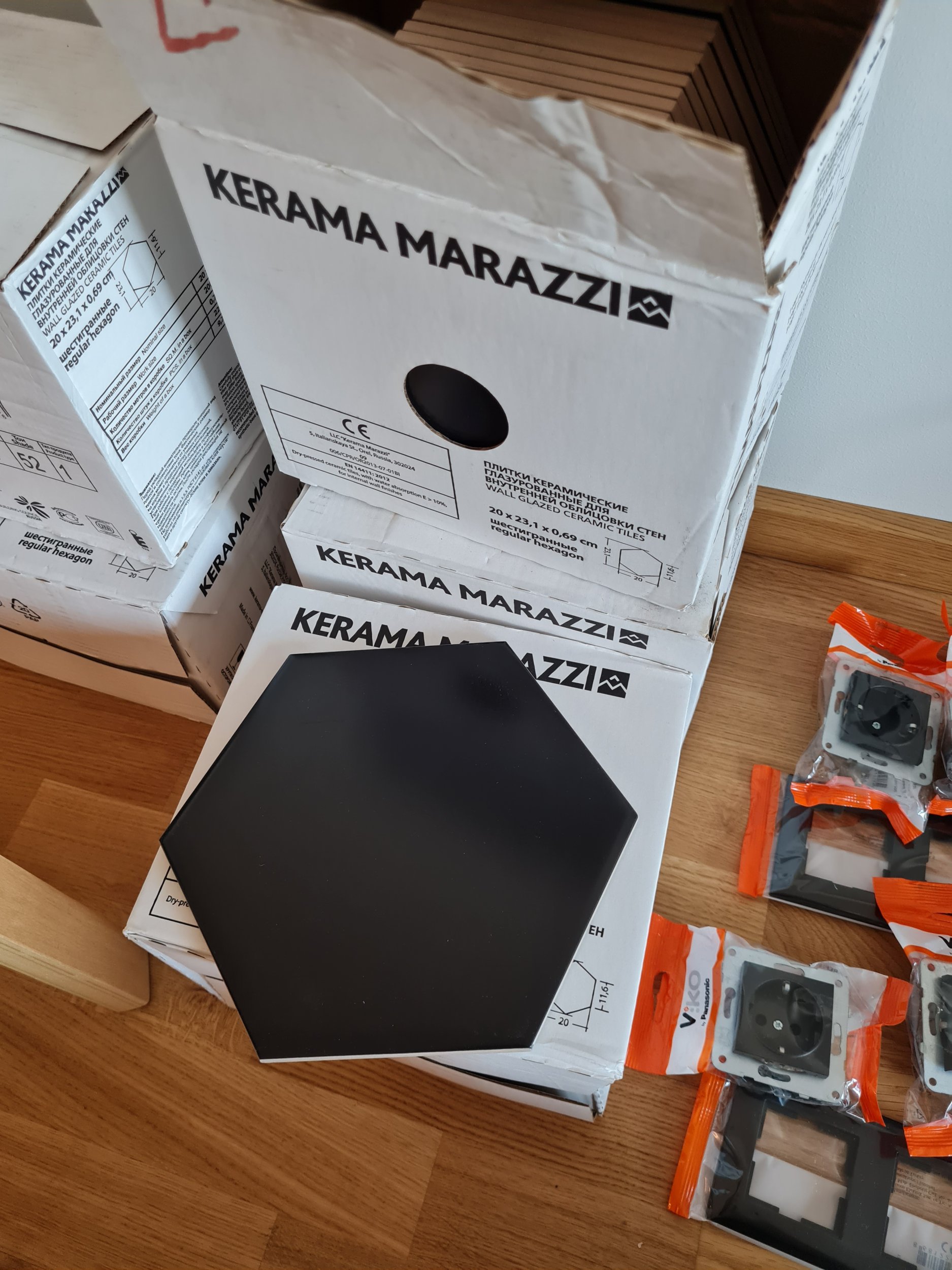 Plaadid on endal olemas - mustad kuusnurksed plaadid. Lisaks sooviks vahetada valged pistikud mustade vastu välja (endal olemas). Vuukimsvahend võiks tulla töö teostaja poolt, sooviks tumehalli.