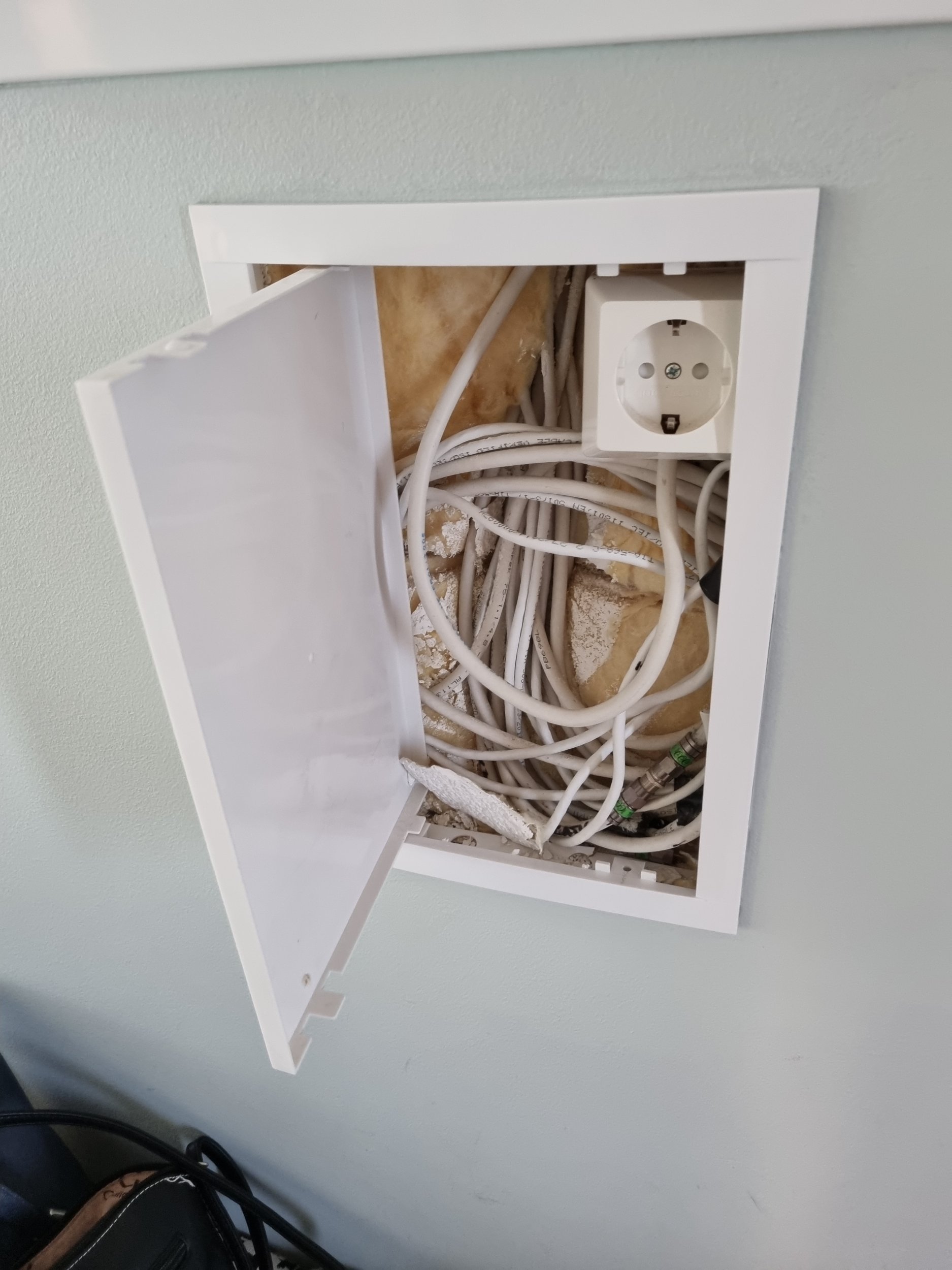 Tehnilise kapi korrastamine ja tagapaneeli paigaldus. Praegu on kapi tagaseinas lihtsalt vill ja juhtmed otse selle peal puntras. Tahame sinna LAN switchi panna, aga ei taha seda otse villa peale panna. Lisaks tuleb LAN kaablitele (neid on 7) panna otsikud, et neid saaks sedmesse ühendada ja ühenduse testimine.