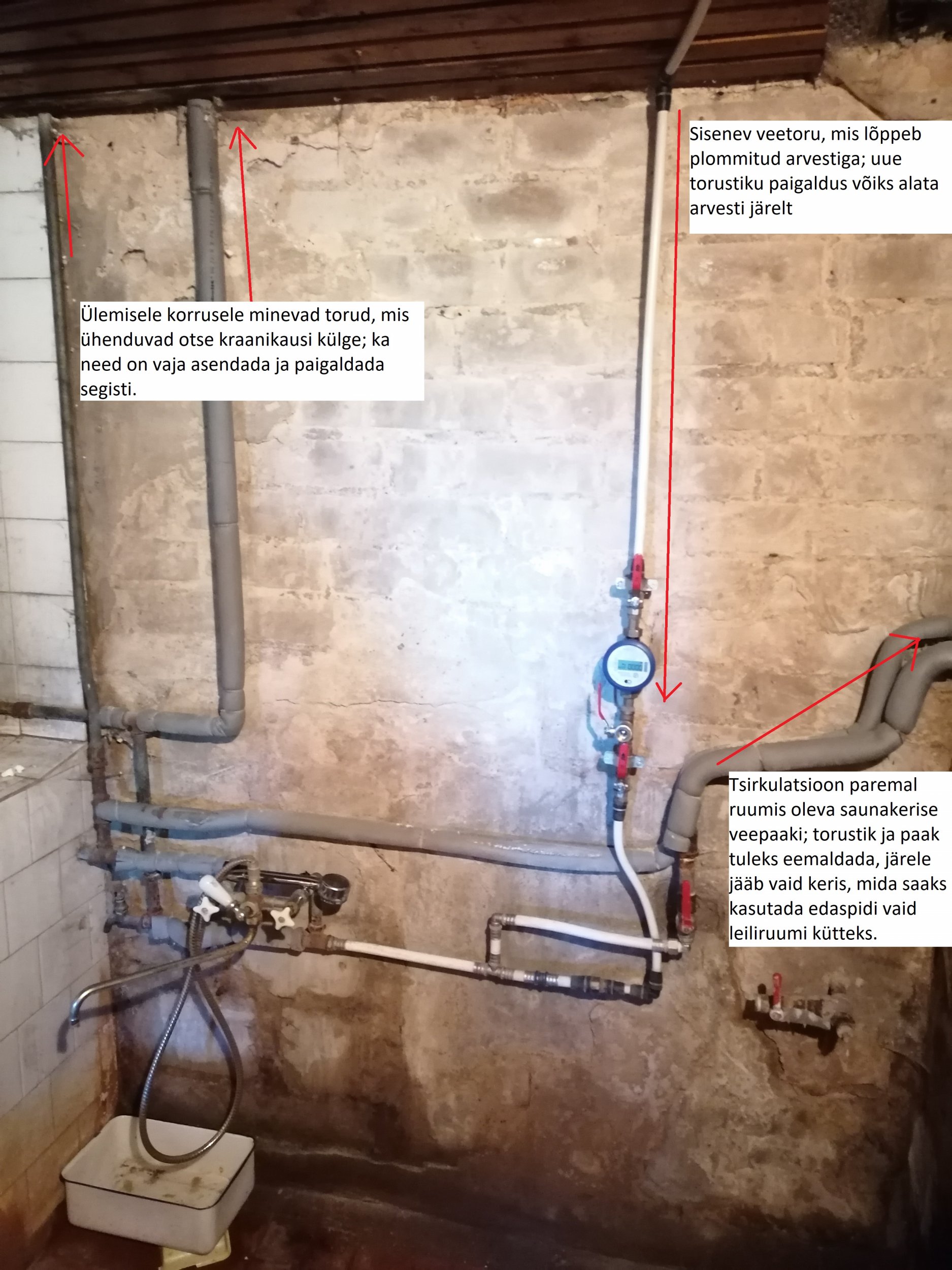 Palun tutvuda hankele lisatud fotoga - torustik on põhiliselt koondunud ühte kohta sauna pesuruumis. Kuna pesuruumi remont ei ole planeeritud, ei ole tarvis arvestada karkassi jms paigutusega. Segistid, torud, liitmikud jäävad avatuks.