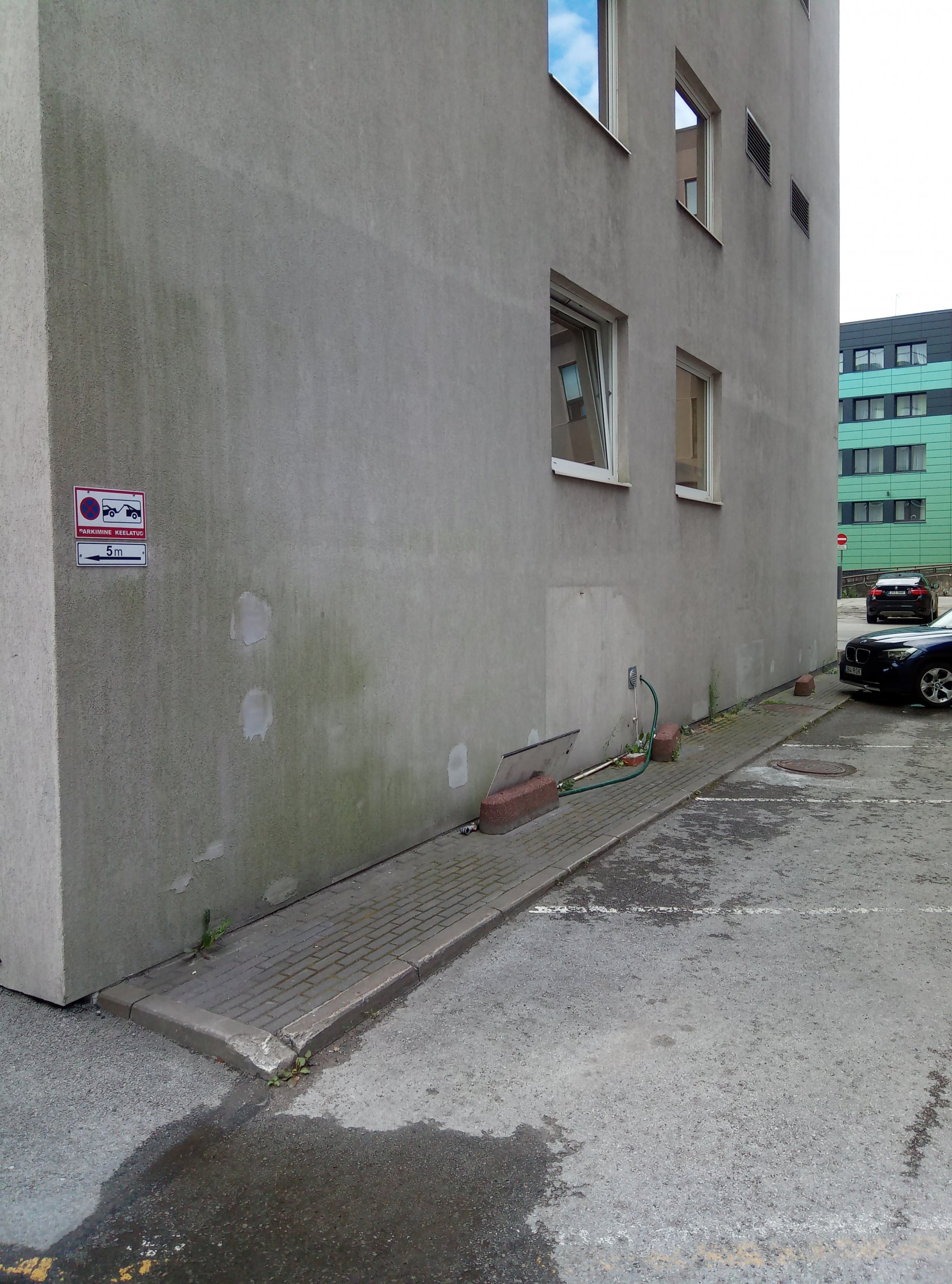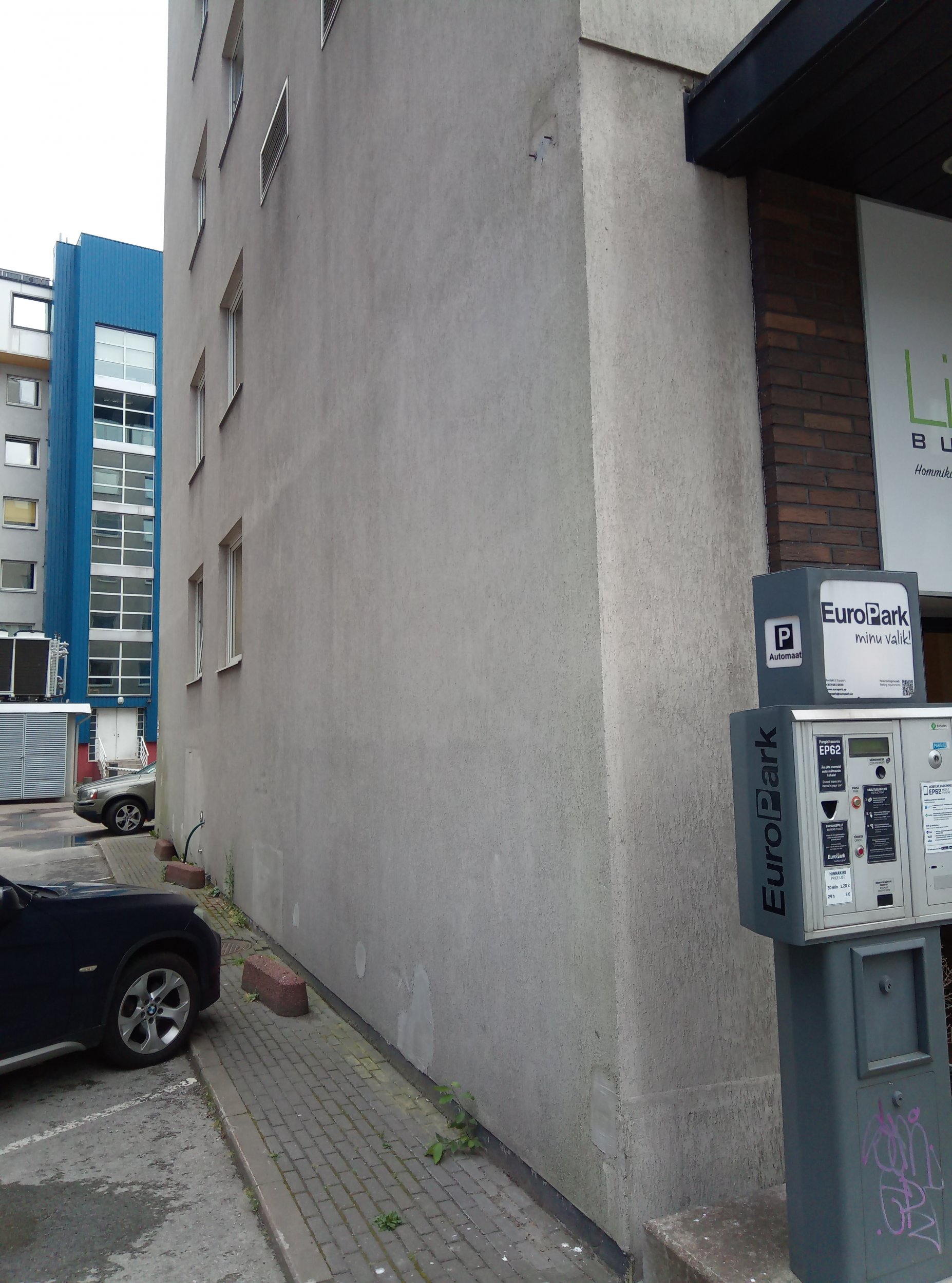 Fassadiosa värvimine. Kaks seinaosa (alumine osa). Kõrguseni kuni ca 420 cm. Seinaosad 1)80x4200cm 2)16500x4200 cm (välja arvatud aknaosad 5,12m2) . Värvus L116 (Värv on meie poolt). Piltidel on need värvitavad kaks seina. Kogu värvitav pind 67,5 m2.