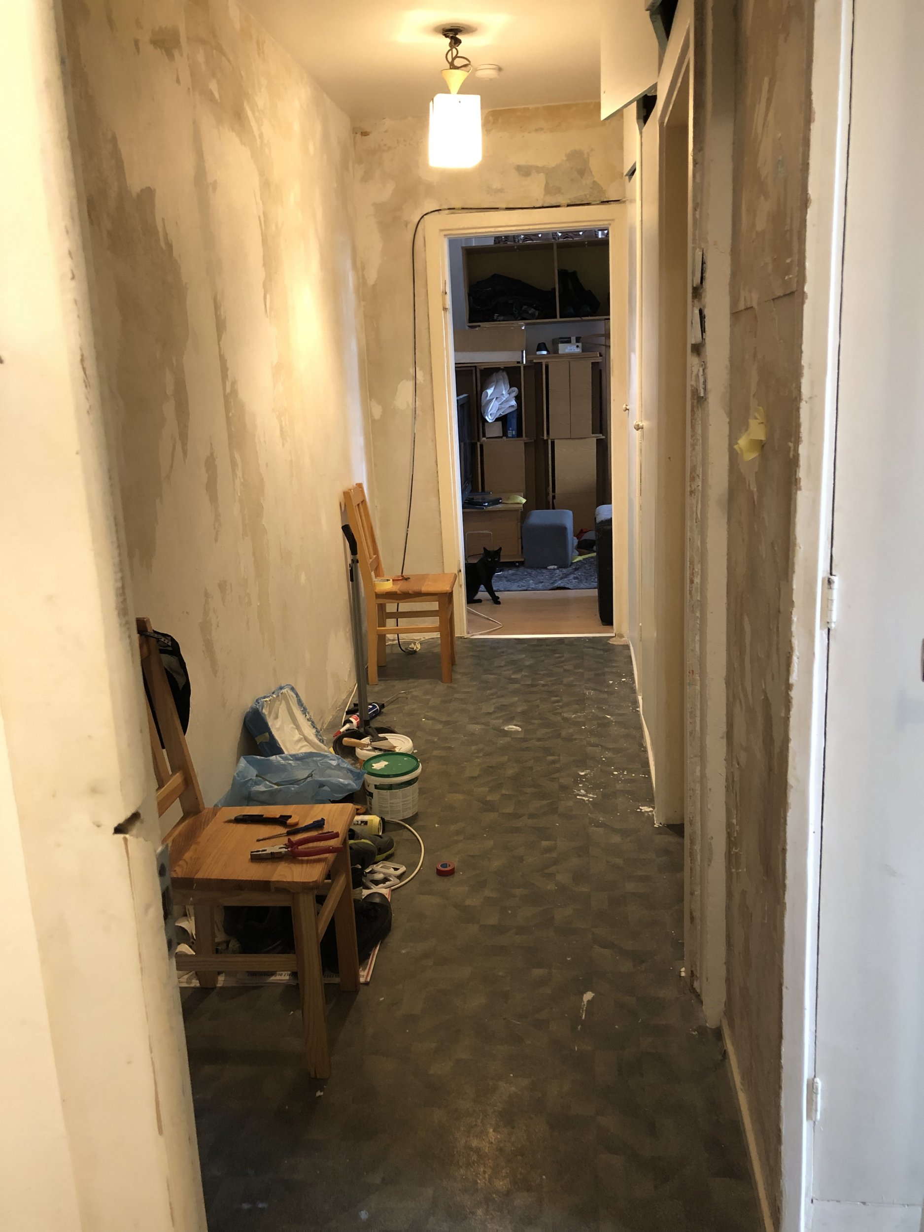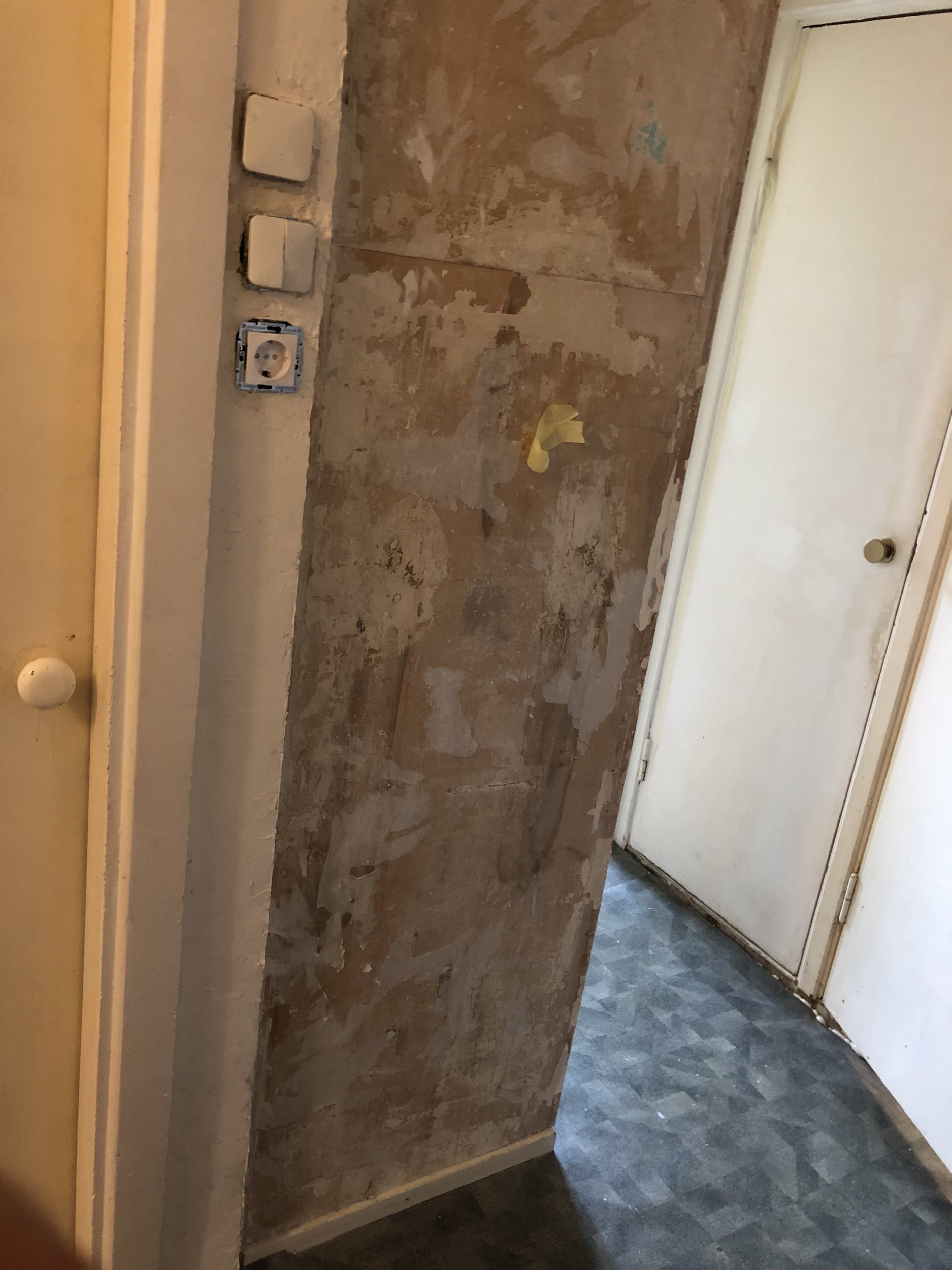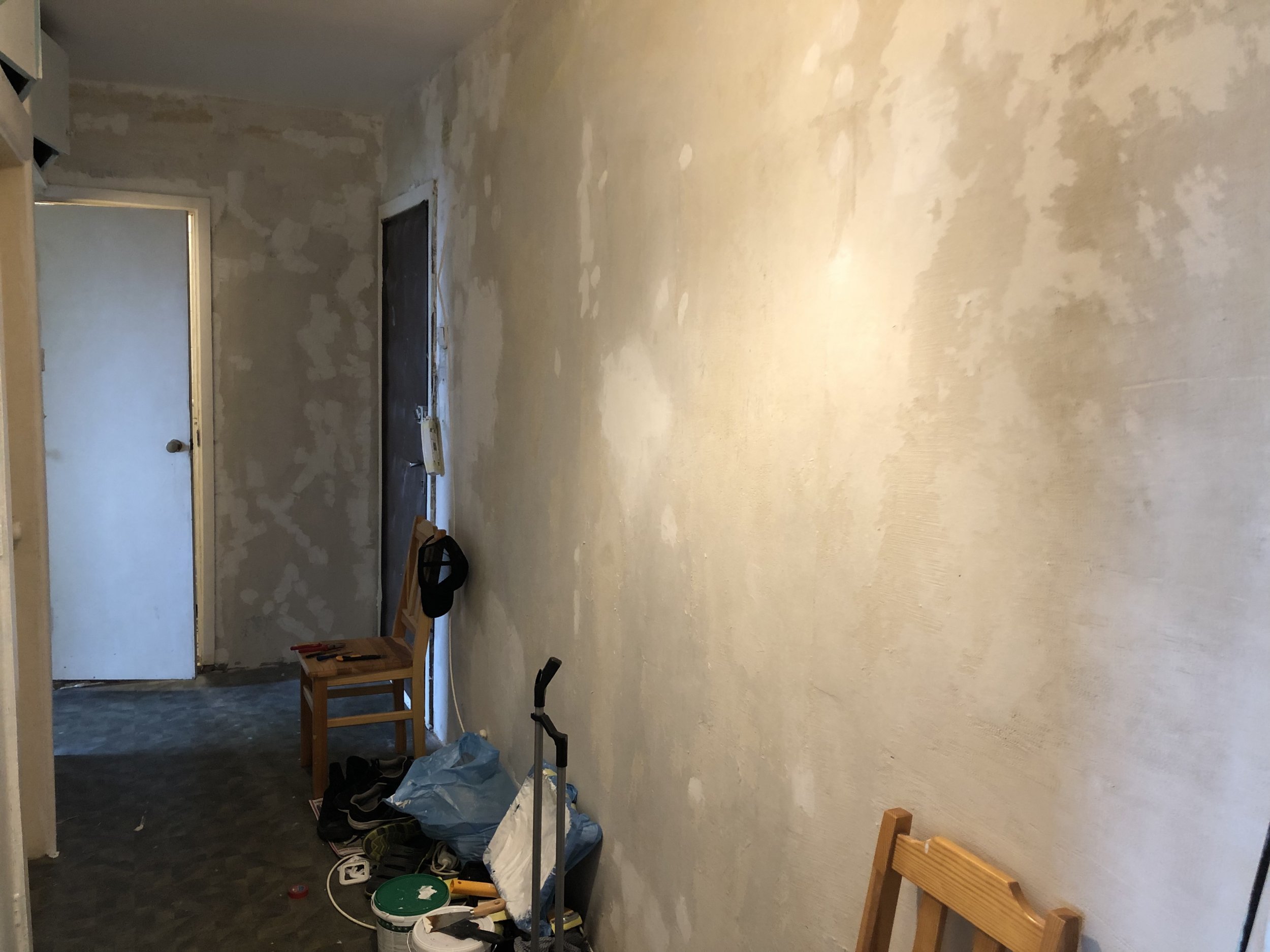 Tegu on nõukogude aegse paneelmaja korteriga, pool esikust on betoonsein, koridori lõpus on WC/vannituba/köök (kuhu remonti hetkel ei tehta) ja koridori teine pool on maast laeni puidust kapid.