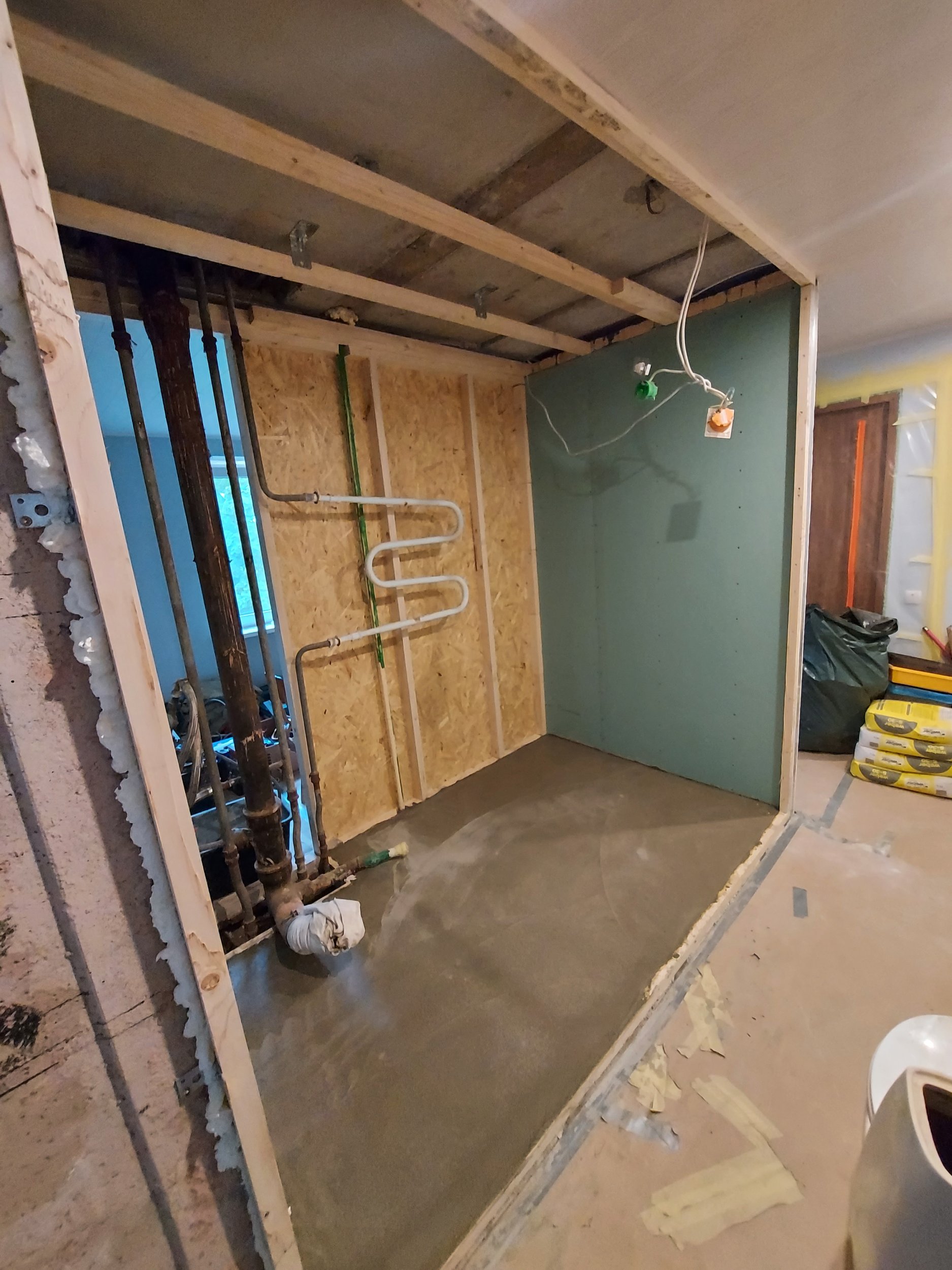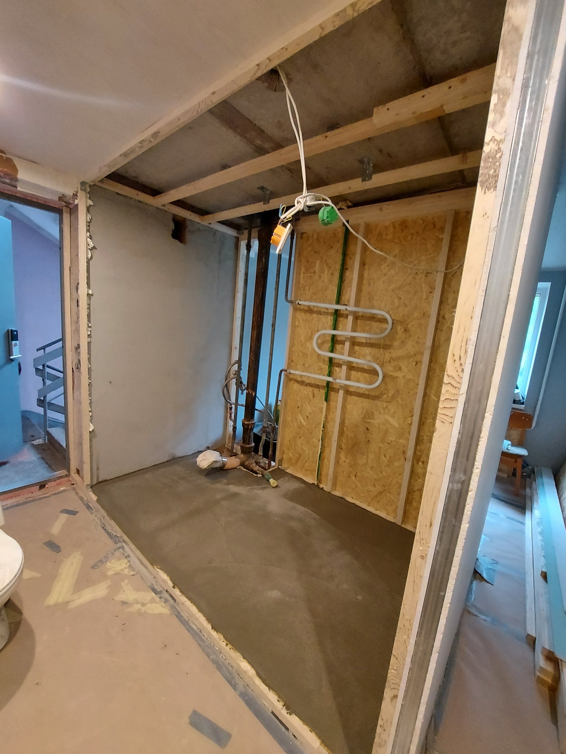Kindlasti on võimalik tulla objektiga koha peale tutvuma. Lisan pildid, mis on tehtud 02.08. Pott ja pesumasin liiguvad nö trepikoja poolsesse seina, duššinurk osb plaadi ja niiskuskindla kipsi liitumiskohta, rätikukuivati tuleb kanalisatsiooni torude ette ehitatavale raamile.