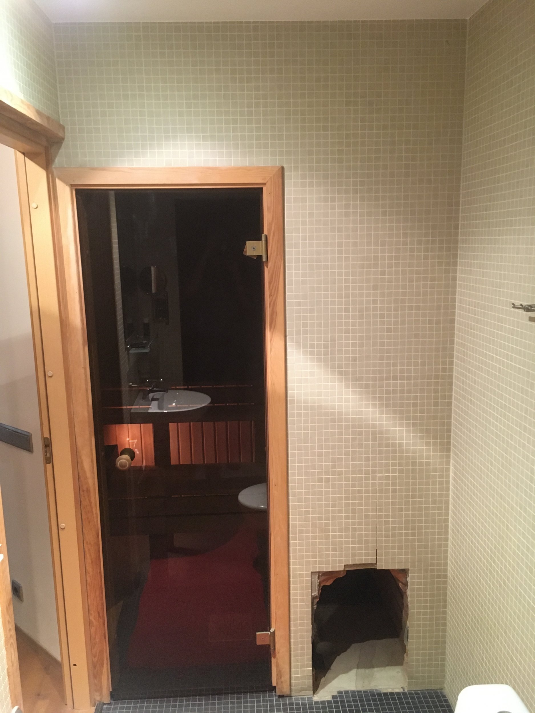 1m laiuse silikaadist sauna seina lammutus ja uue kipsist ehitus ja leiliruumist viimistlus dekoratiiv plaadiga. Vannitoa poolt valge värv. Sauna elektri kerise paigaldus.(juhe veetud kilbist). Sauna ukse eemaldus ja hiljem tagasi paigaldus. Leiliruumi põranda viimistlus vana ahju kohast.