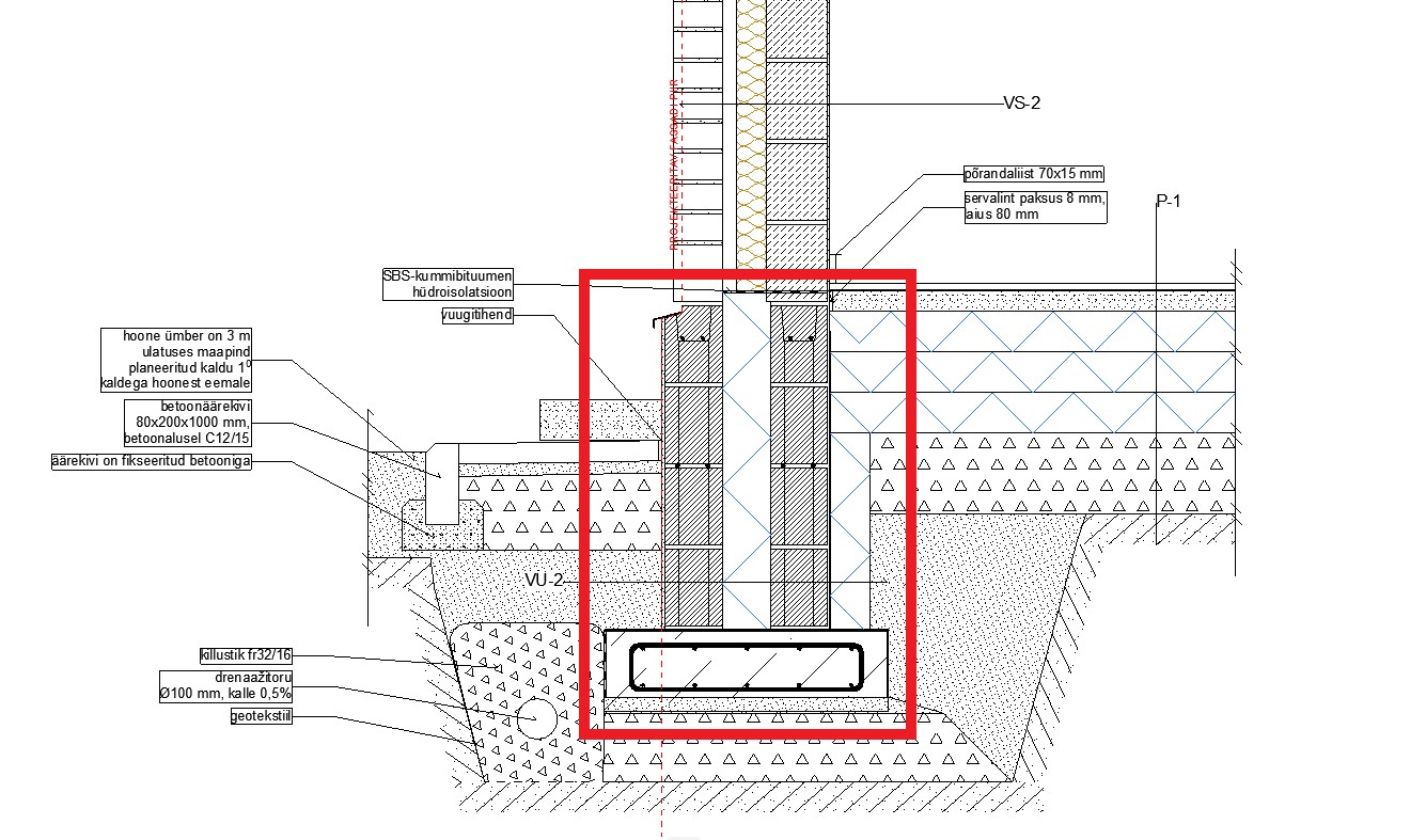 3) Columbia kivi 140 mm õõnesplokist koos XPS soojustusega vundamendi rajamine kuni hoone 0 kõrguseni.