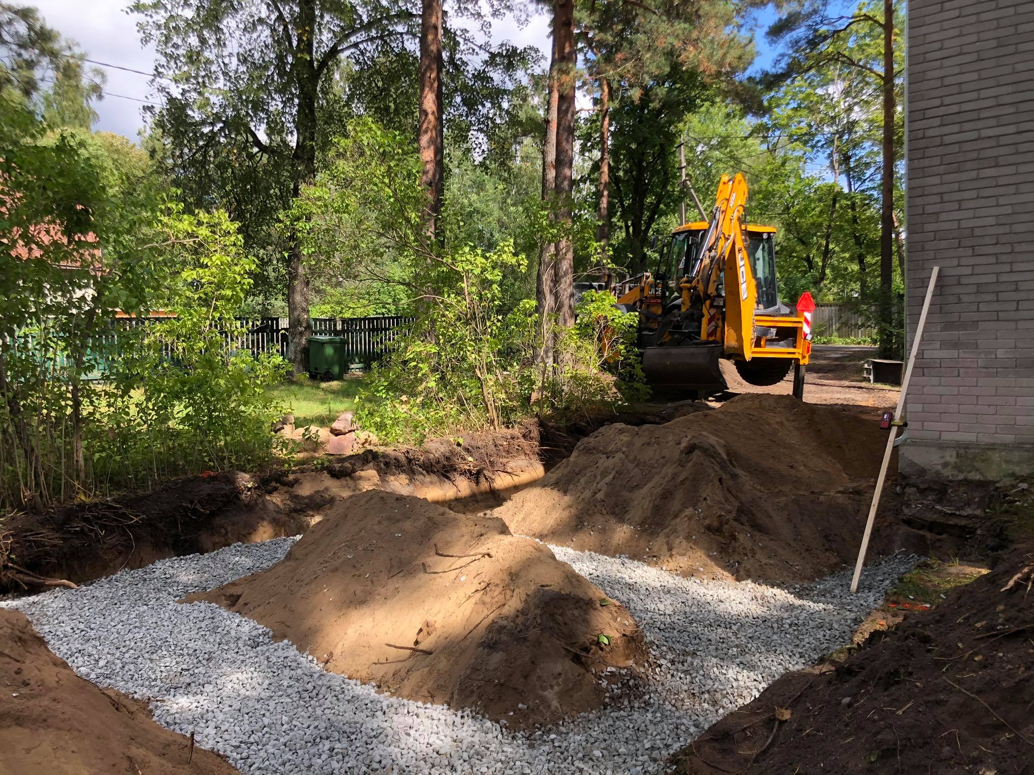 Olemasolev olukord: väljakaeve on tehtud, vundamendi alused torustikud on paigaldatud, killustikalus on ehitamisel.