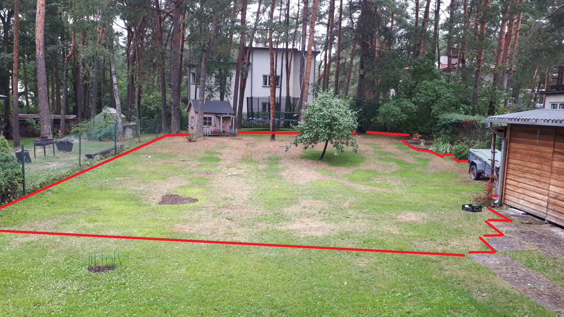 Objekt Tallinnas, Nõmme, Kurni 44. Rajatava muru ala on pildil näidatud punase joonega ümbritsetud. Ala laius ca 16m, ala pikkus ca 23m.