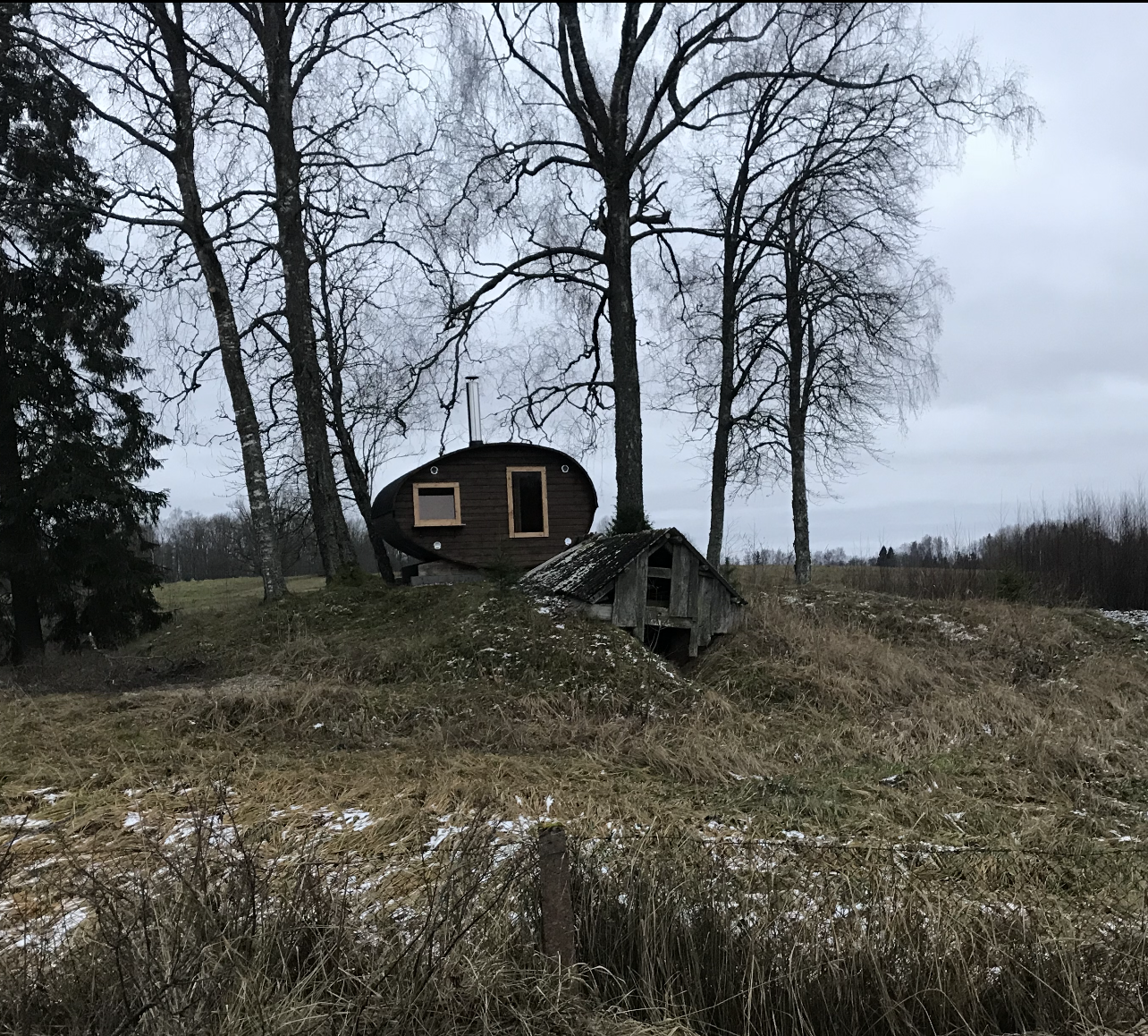 Vana maakeldri süvendisse rajada betoonpõrandaga ja plokkidest seintega külm hoiuruum metallist turvauksega. Mõõdud jääksid samaks mis olid maakeldril ehk 3m lai ja 4m pikk, aga kõrgust tuleks juurde kaevata natukene (~0,5m kuna sisse langenud ka kohati küljed) ehk see võiks olla näiteks 2m (vana viilkatuse osa lammutan ise enne ära). Uks võiks olla 1,5m lai ja lagi peaks olema lame ja kas betoonist valatud või paneelidest (kumb soodsam) ning bituumenkattega. Hoone katusele rajada samas mõõdus ehk 3x4m sauna terrass puidust (sauna alusega ehk künka tipuga samas tasapinnas). Terrassile hiljem plaanis paigaldada vb ka kümblustünn (hoone peab selle ära kandma + inimesed). Ligipääs on üle põllu kruusateelt mis on 50m eemal (saun toodi suure veokaga künkani).