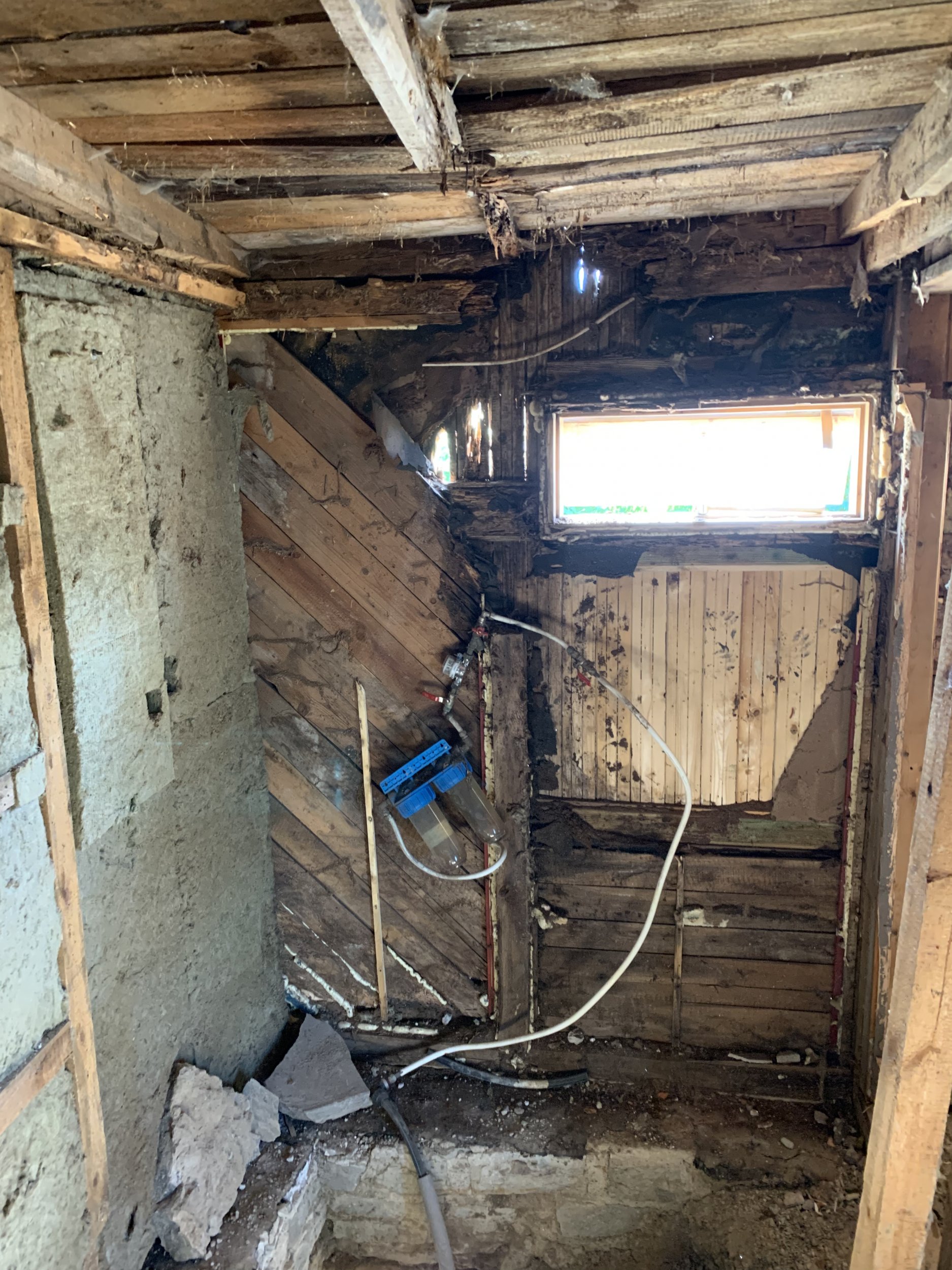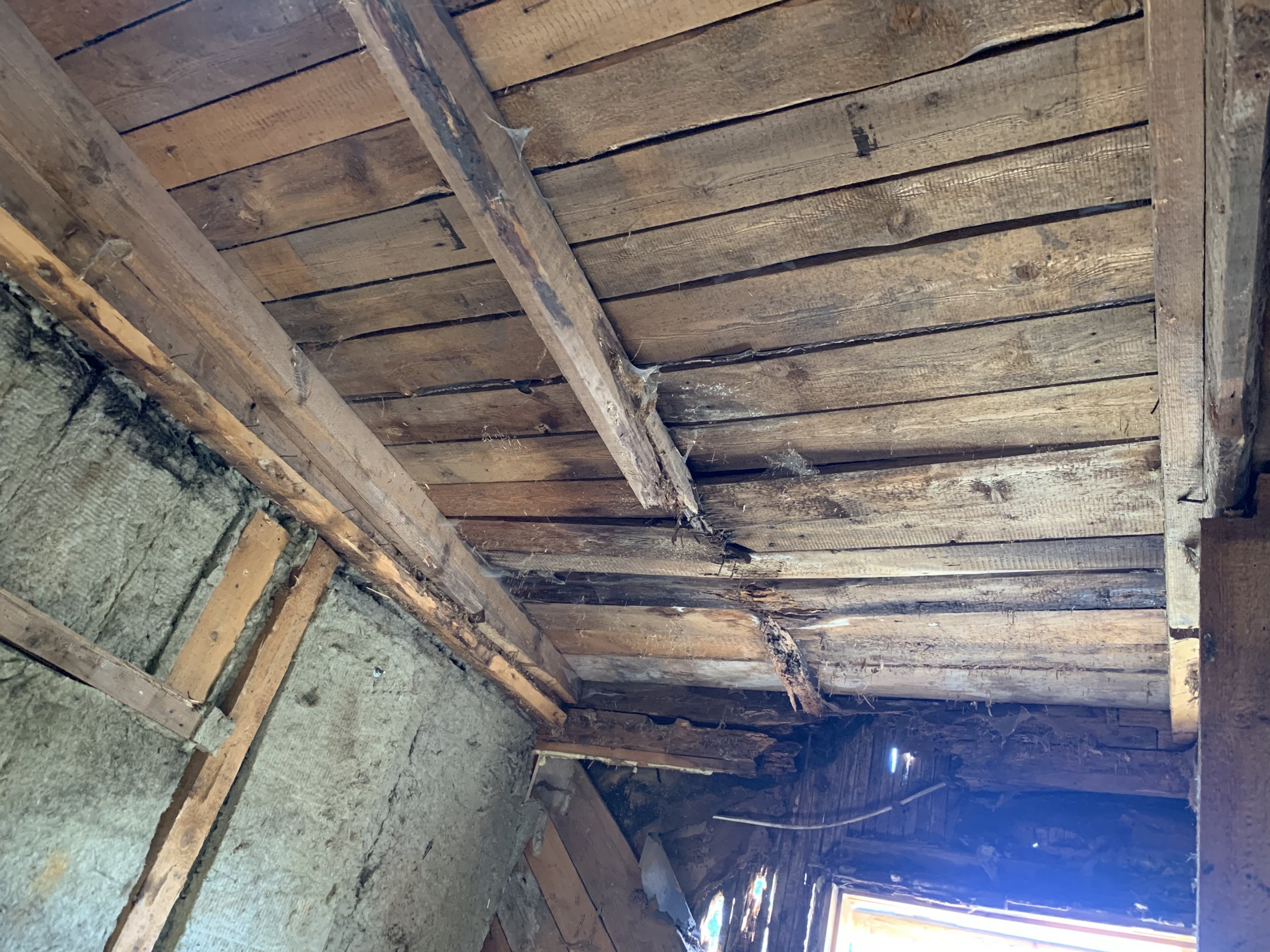 Mõned palgid on läbi mädanenud nii katuse poolt umb 2 m2 kui ka välisseina poolt umb. 3m2 , tuleb karkassi taastada ja uusi seini ehitada, edaspidi plaadimiseks.