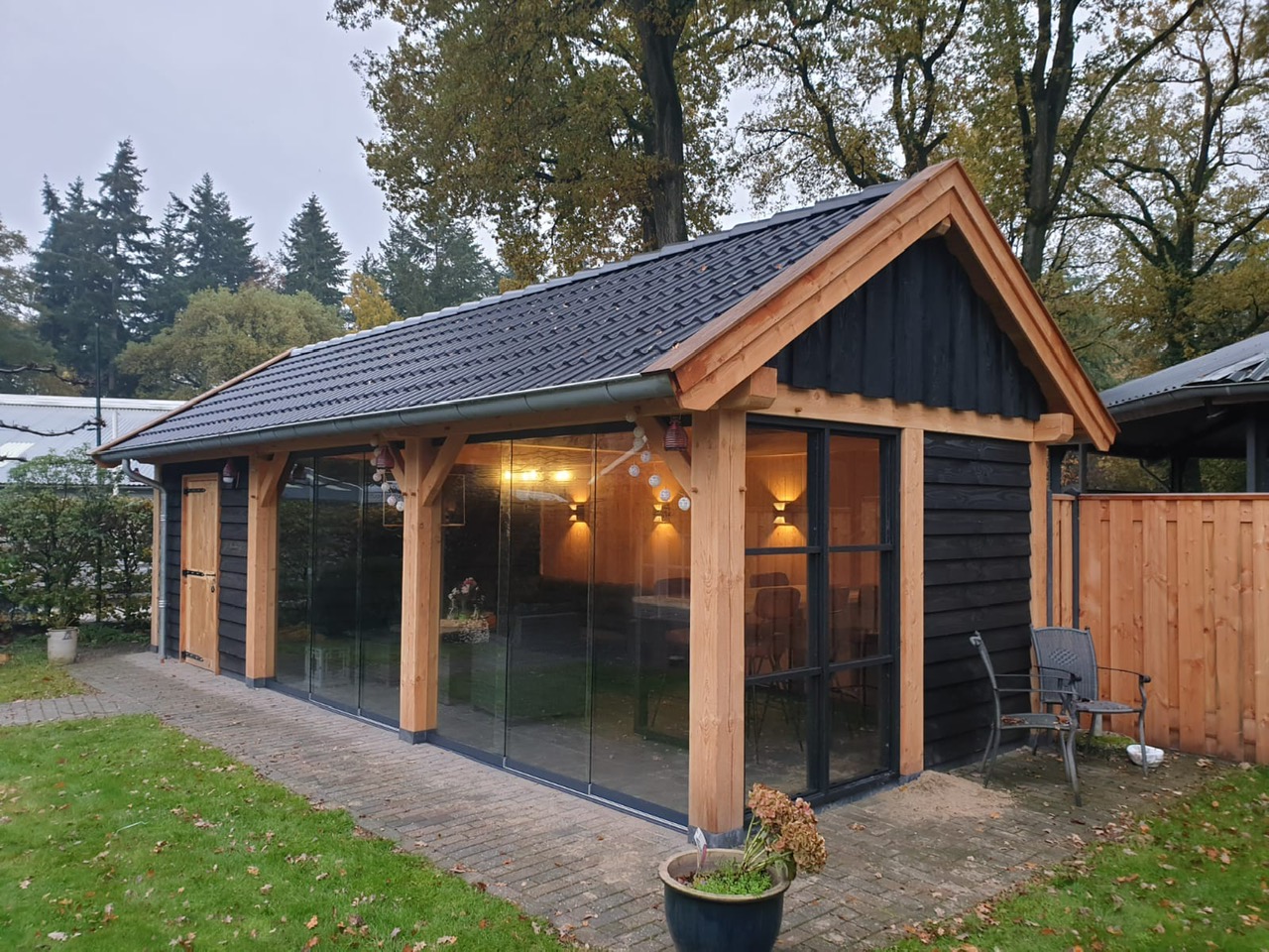 Varjualune 7,5m x 4m viilkatusega (väikseima kaldega, mida teha saab). Tagumine ja täissein kaldega kattega, paremal küljel 1,5 x 4 m kinnine ruum (ukse ava väljas ja ukseava sees). Katuse pikendus terassile vasakult küljelt ca 3m. Esikülg ja vasak külg kitsa võre seinaga (toon tume). Puitmaterjal heledat ja tumedat tooni. Vastupidav, korralik materjal!