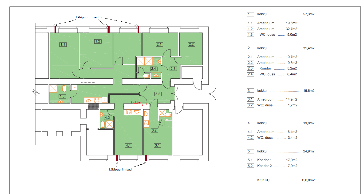 6) Ventilatsiooni lahendamine 1 toalises ja suures korteris. Variandina on läbiviikude puurimine 5tk+ sundventilatsiooni paigaldamine läbiviiku või suunata ventilatsioon lõõridesse.