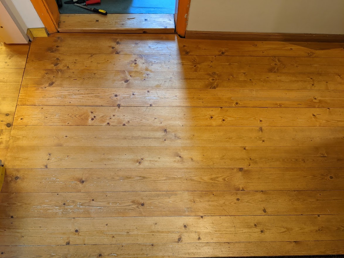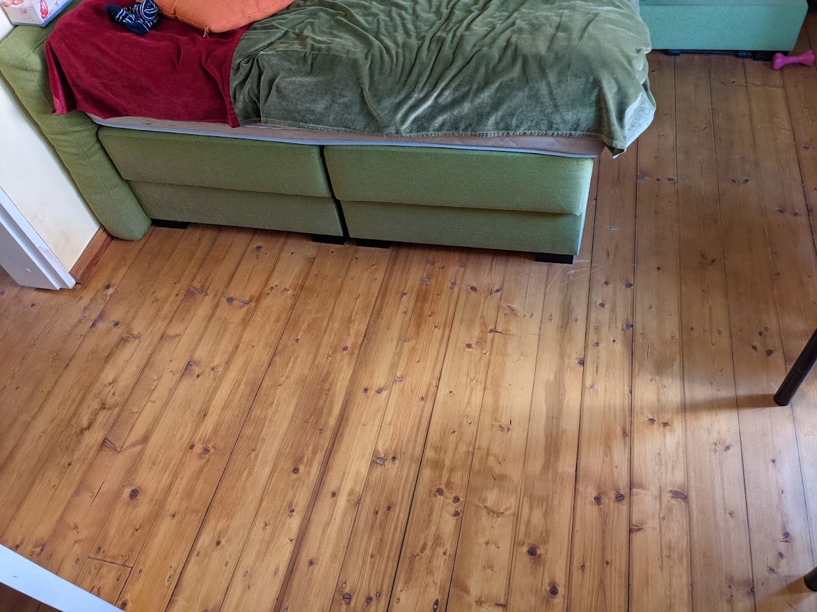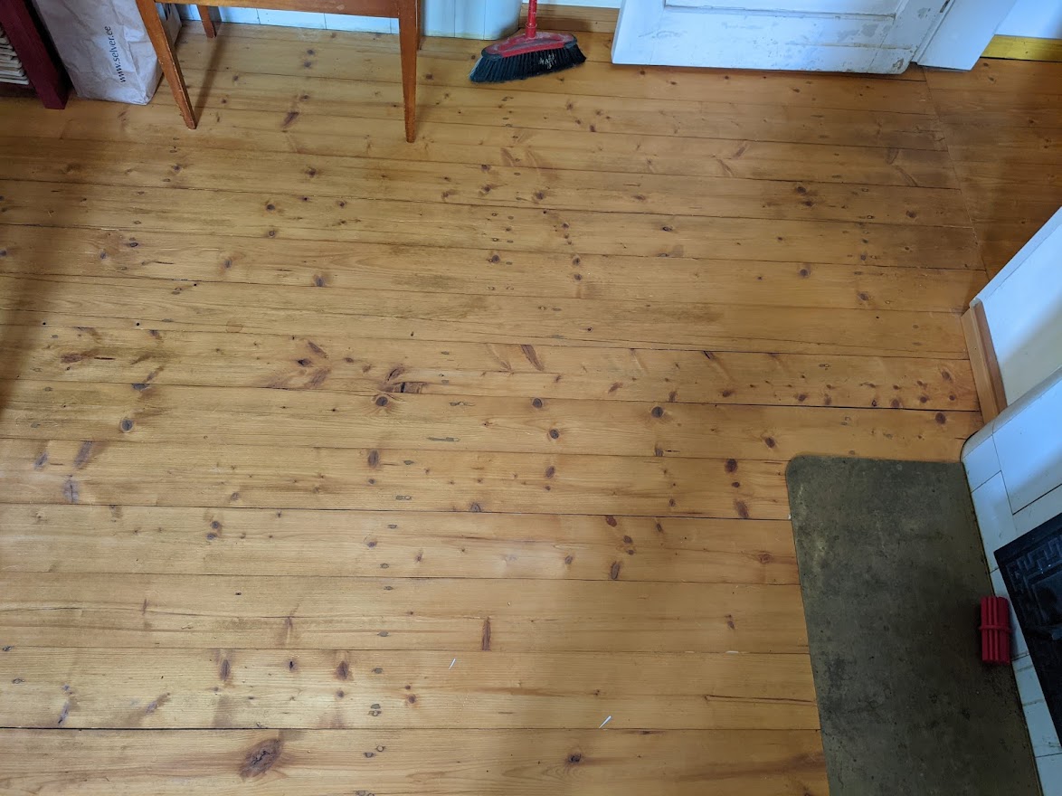 Vaja oleks puhastada ja hooldusõlitada põrandaid. Põrandad on eelnevalt õlitatud linaõliga, mõned aastad tagasi. Oleks vaja teha süvapesu ja siis käiguteesid ja muid kulunud kohti uuesti õlitada. Mõnes kohas tuleks ka puidupahtliga väiksemaid parandusi teha. Suurem mööbel (raamaturiiulid, puhvetkapid jms) jääb paika. Põrandapinda on kokku ca 65 m2, aga osa sellest on mööbli all jne.