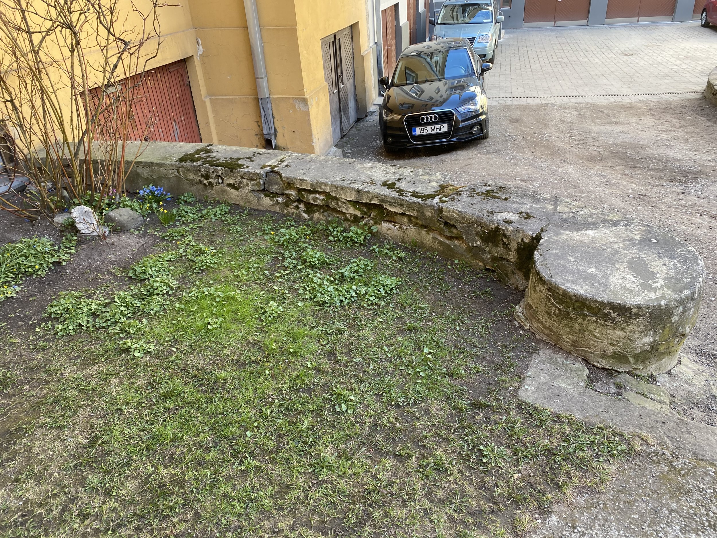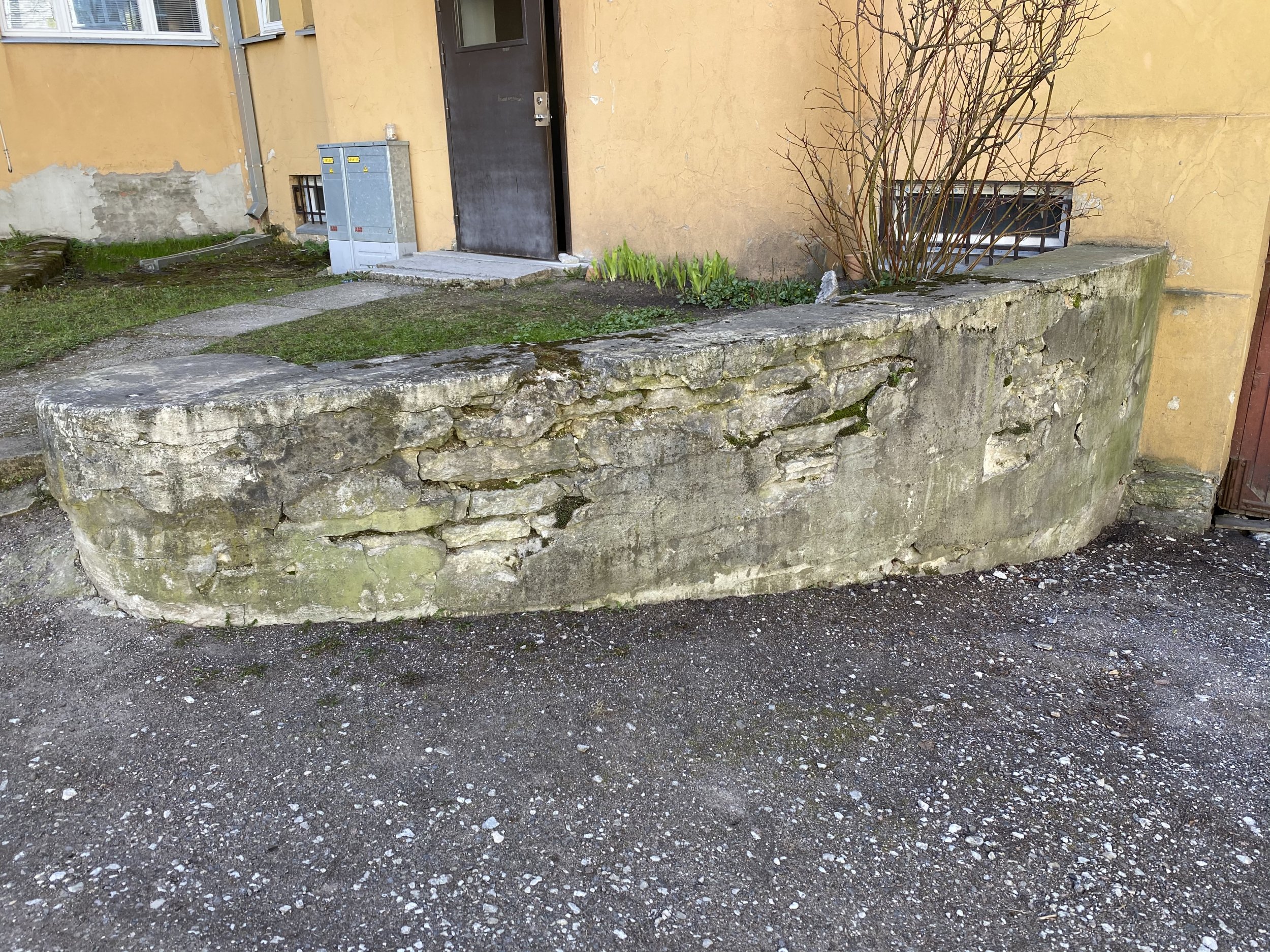 Kortermaja hoovis asub väike jupp paekivist müüri.