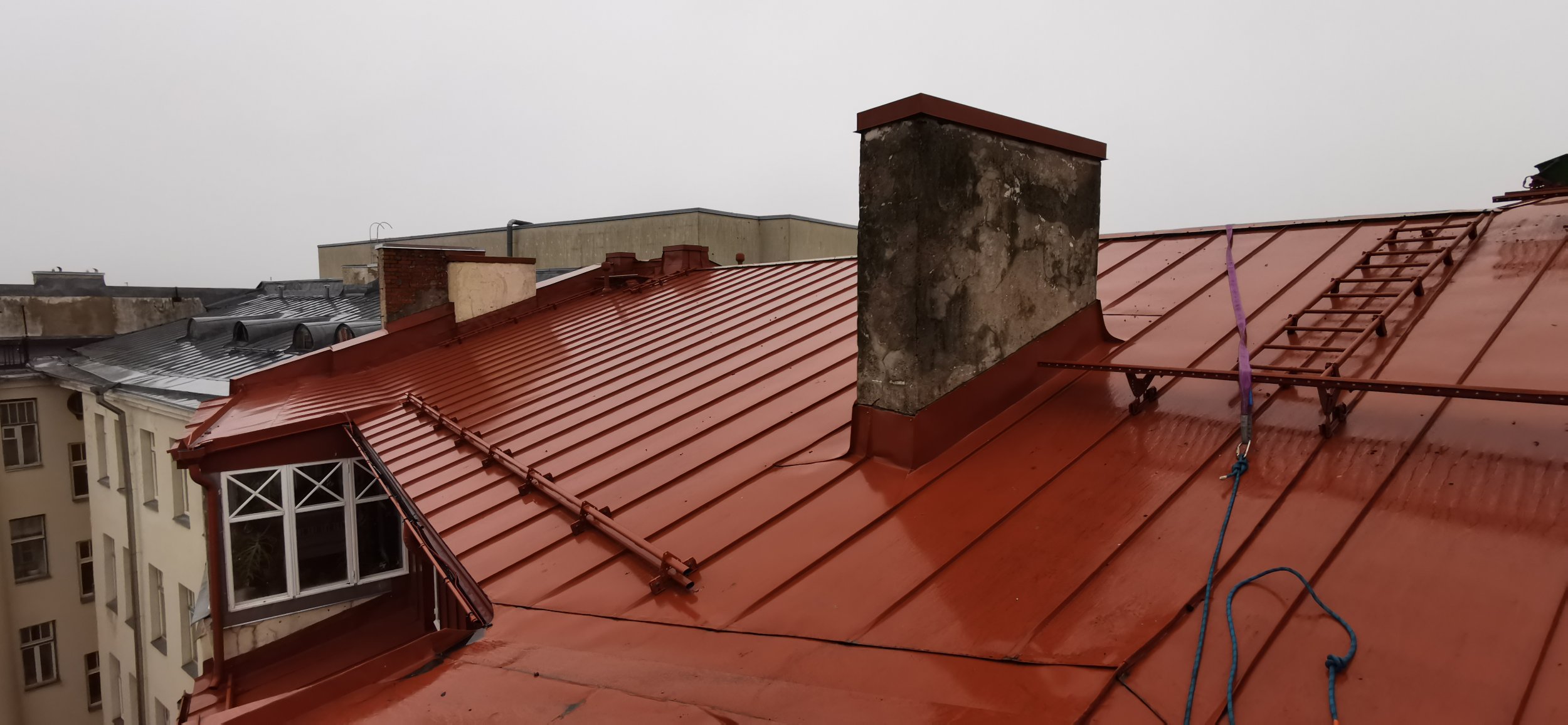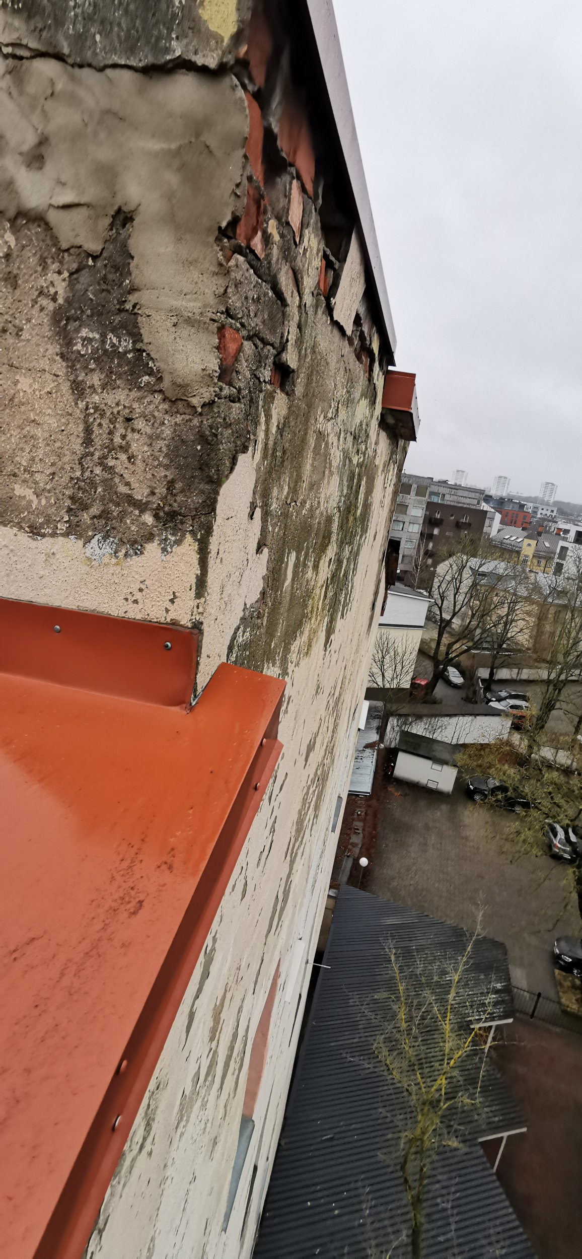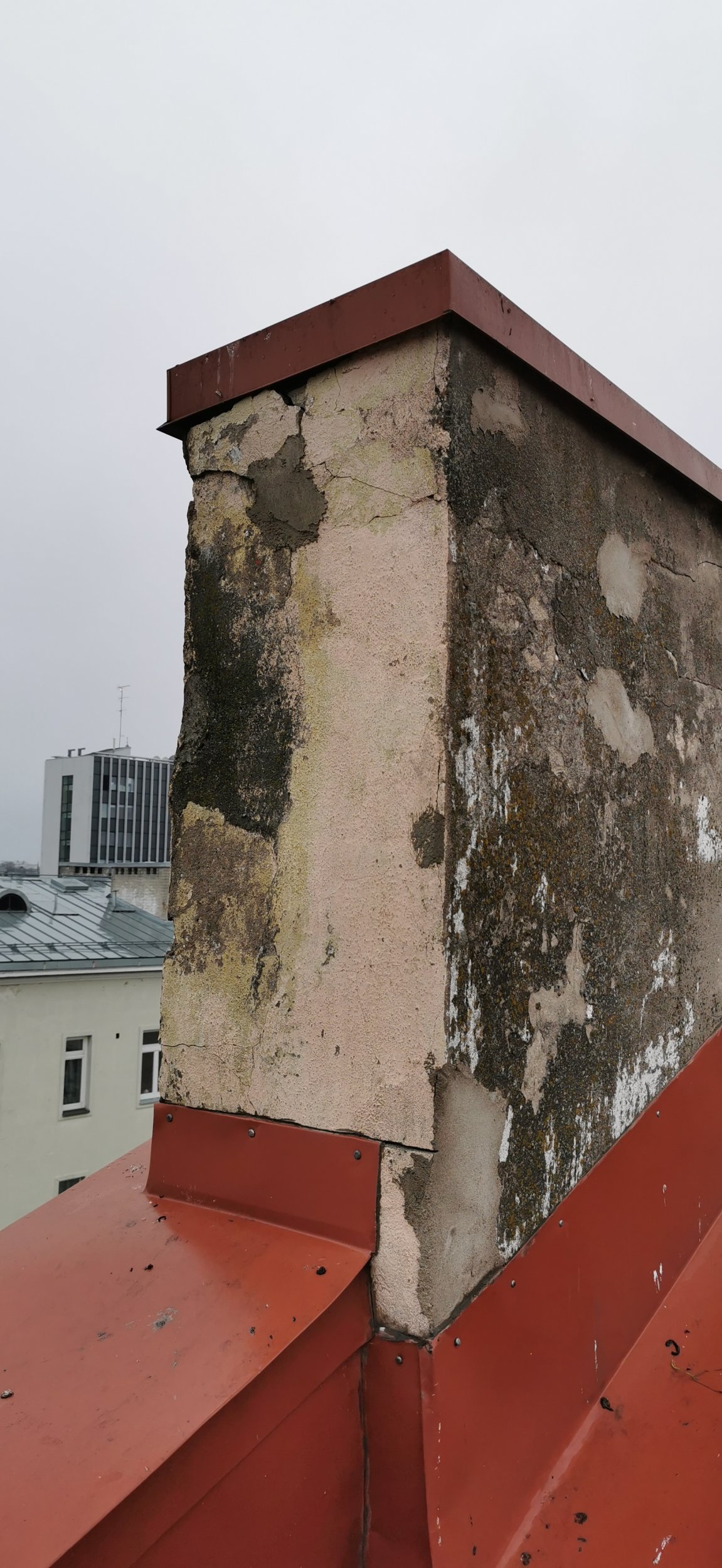 Maja korstende remont (maja servadel ja keskel, seisukord erinev); vana krohvi eemaldamise, katkiste telliskivide asendamisega ja uuesti krohvimisega. Plekist 'mütsid' taaskasutatavad.