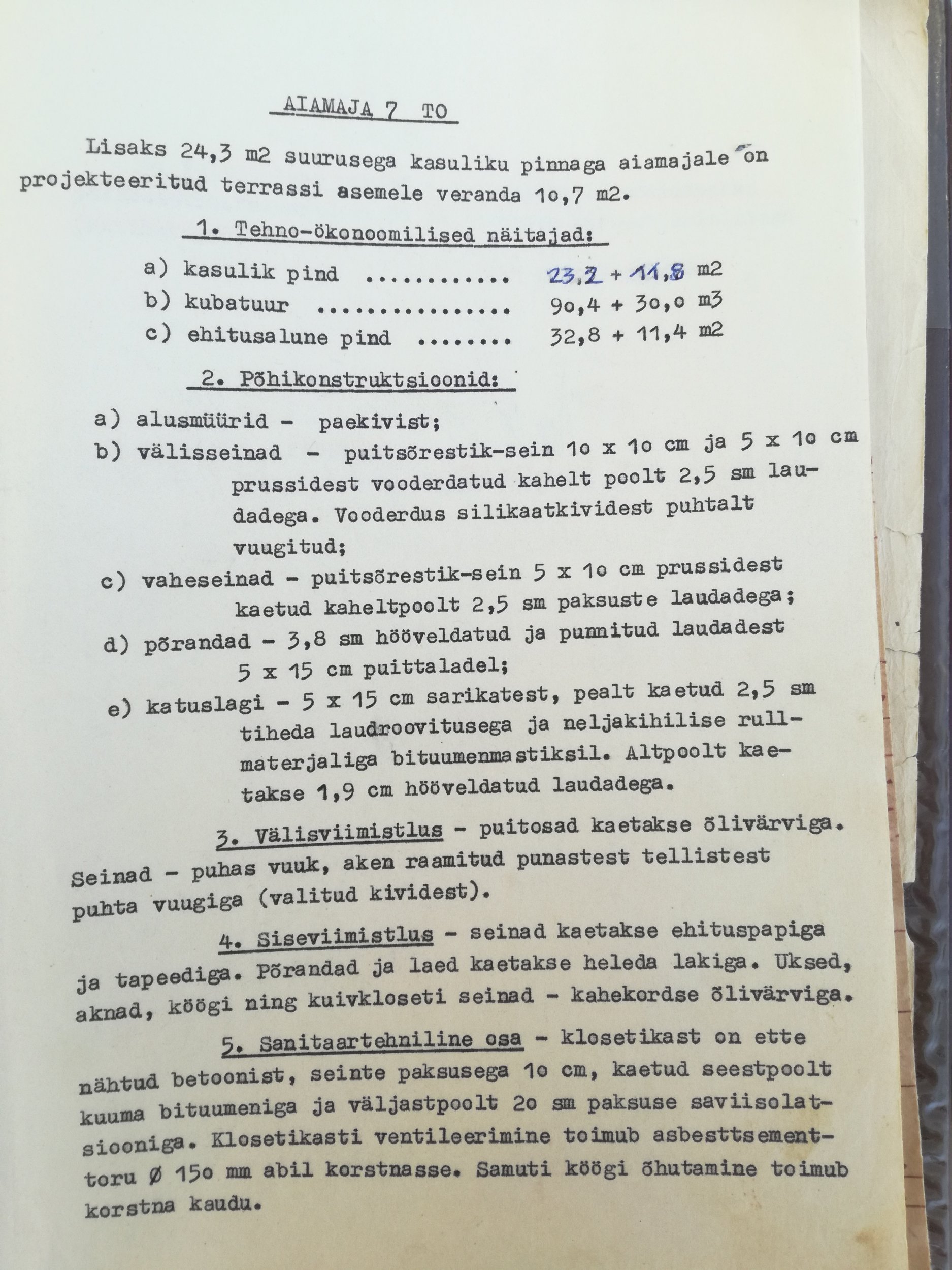 Maja originaalprojekt on olemas 67. aastast aga hoonet on muudetud nii seest kui väljast. Juurde ehitisi eriti ei ole aga näiteks auto varjualune ja veranda on kinni ehitatud (tegu vana suvilaga). Geoalus on olemas aastast 2013. Osaliselt on andmed EHR's uuendatud aga mitte 100%