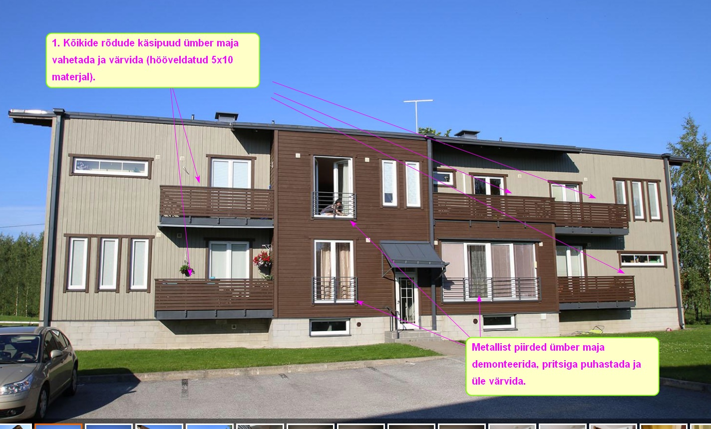 Kortermaja Tartu, rõdupiiretel puidust käsipuude vahetus (höövelmaterjal 45x95mm , värvitud Pinotex Ultra Lasur pähkel). Ca 45jm.