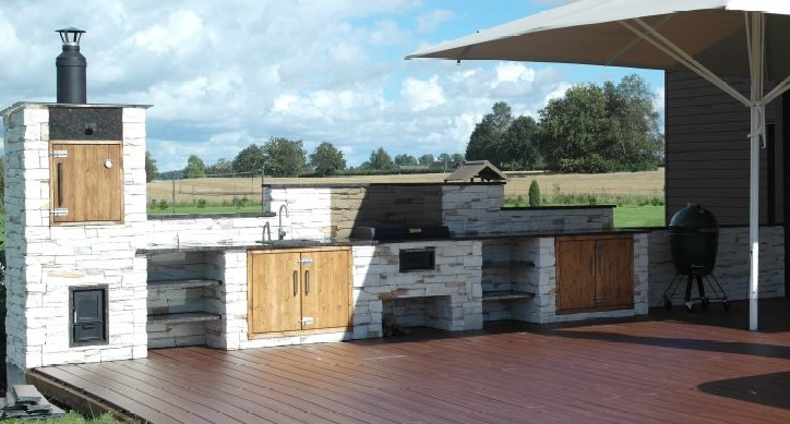 Järjest: korsten, suitsuahi, puuriit, grill/kamin, töötasapind ja kraanikauss.