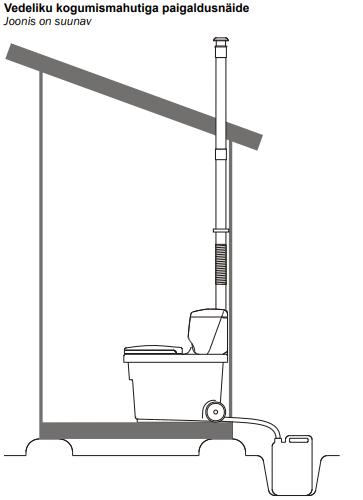 8. Eraldatud vedelik juhitakse käimlaseadmest vedelikupaaki, mis saab olema käimlast väljapool (tuleb teha läbiviik juhtides toru läbi seina, vooliku läbimõõt on 32mm - teie poolt oleks tarvis siis vastav valmidus ehitada, poti paigaldusega saame ise hakkama). Läbiviigu ehitamisel tuleb jälgida, et tekiks piisav kalle, mis tagaks vedeliku takistamatu voolu kogu äravoolu pikkuses.