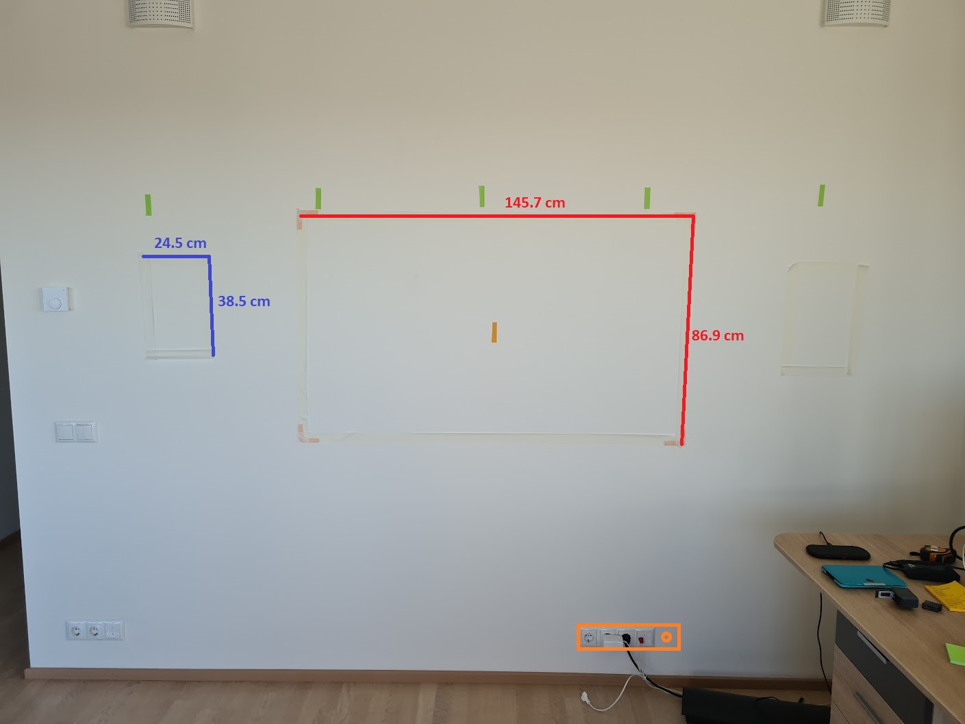 Joonisel on näidatud ka karkassi asukohad. Ilmselt on võimalik neid kasutada, et seina kandevõimet tugevada ja raske televiisor ja kõlarid neid kasutades paigaldada.