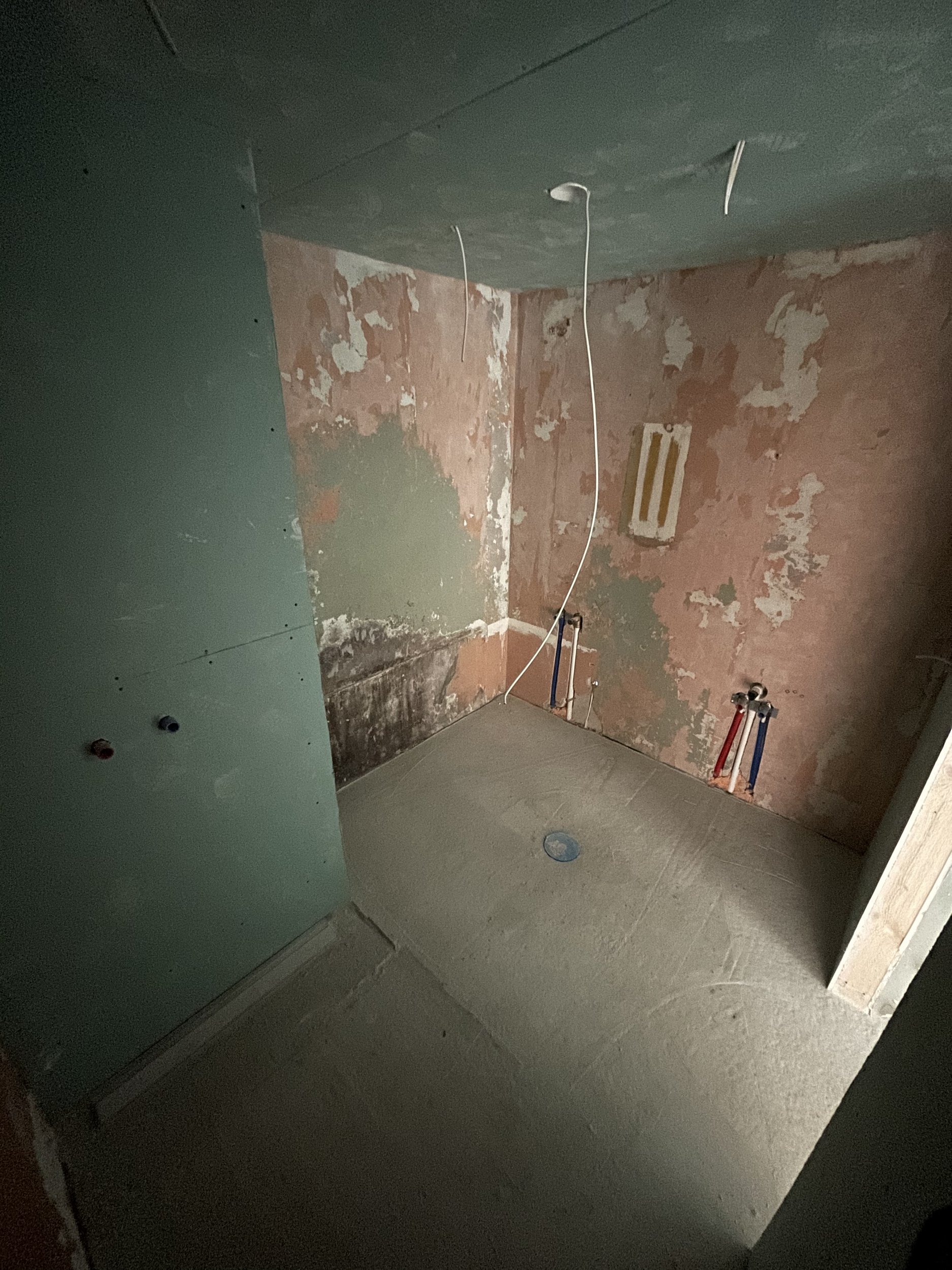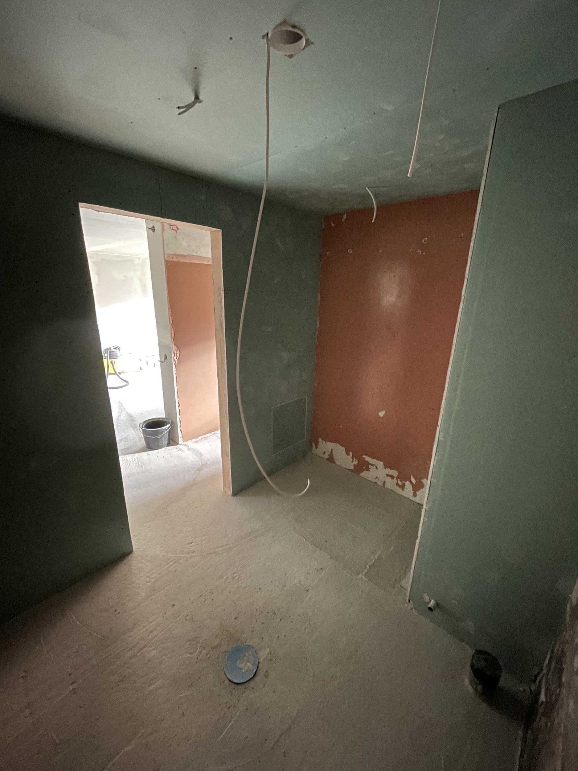 Põrand valatud betooni (kaldega, renn ja avariitrapp paigas) ning seinad osaliselt paneel, osaliselt kips.