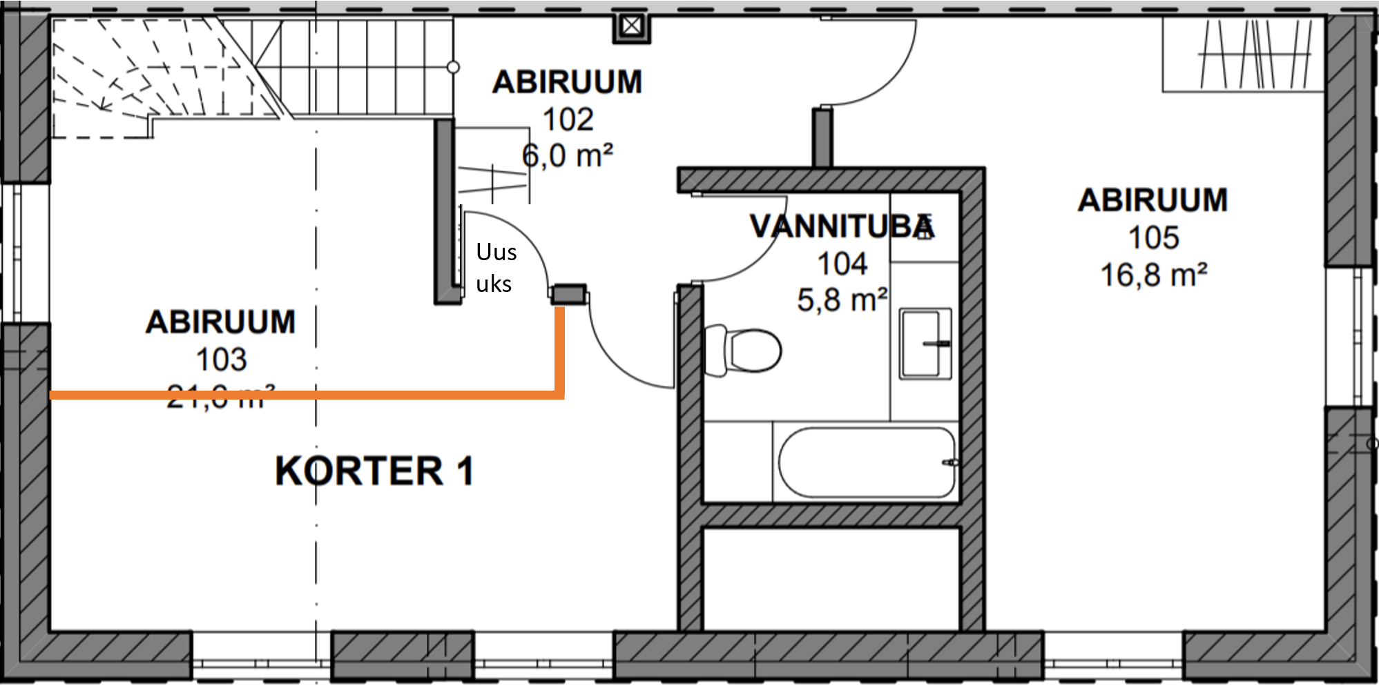 Korteris on tuba mõõtmetega 20,6m2, mida jagatakse 2 lapse poolt. Idee on lisada sein ja uks, mis eraldaks tuba ehk siis muudaks toa kaheks, et kummalgi lapsel oleks enda tuba.