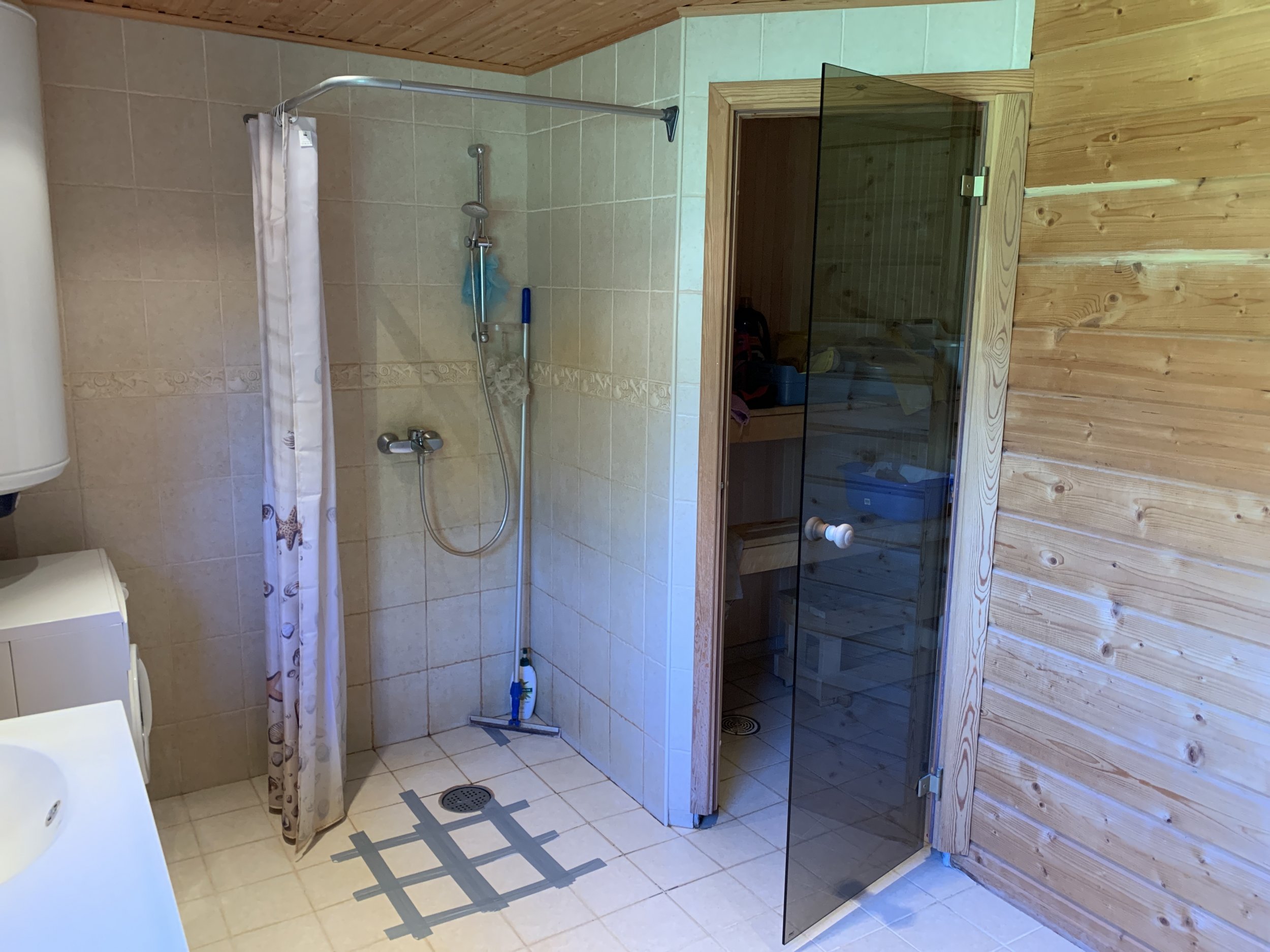 Dušinurga ja sauna põrand on ära vajunud, vee äravoolu kalle ei toimi ja vesi on plaatide vahele pääsenud. Põrand vajab ülesvõtmist ja tulevikukindlamat lahendust.