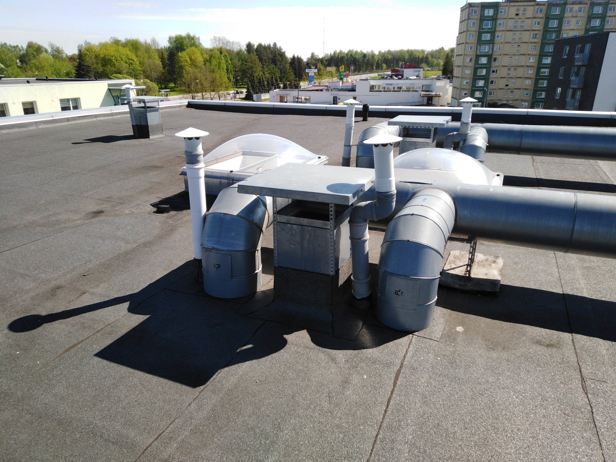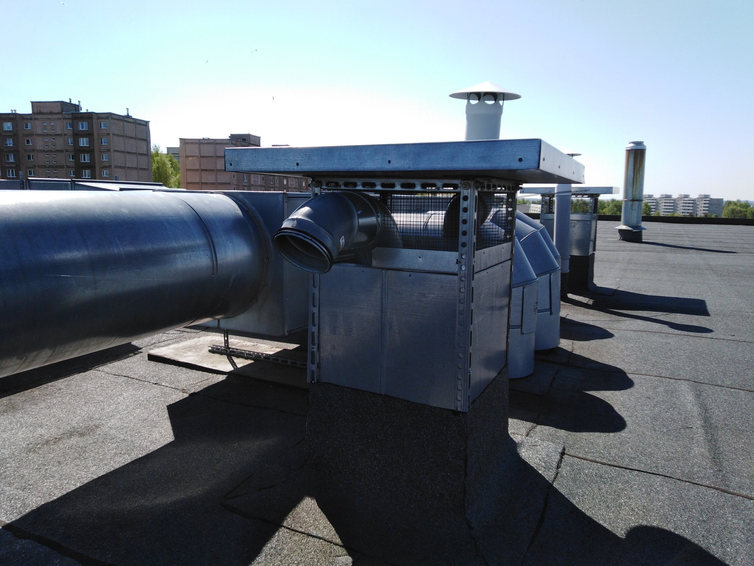 Kortermaja katusel asuvad köögiventilatsioonitorude otsad 4-torustes karpides. Läheduses on ka kanalisatsioonitorustiku õhutustorud.