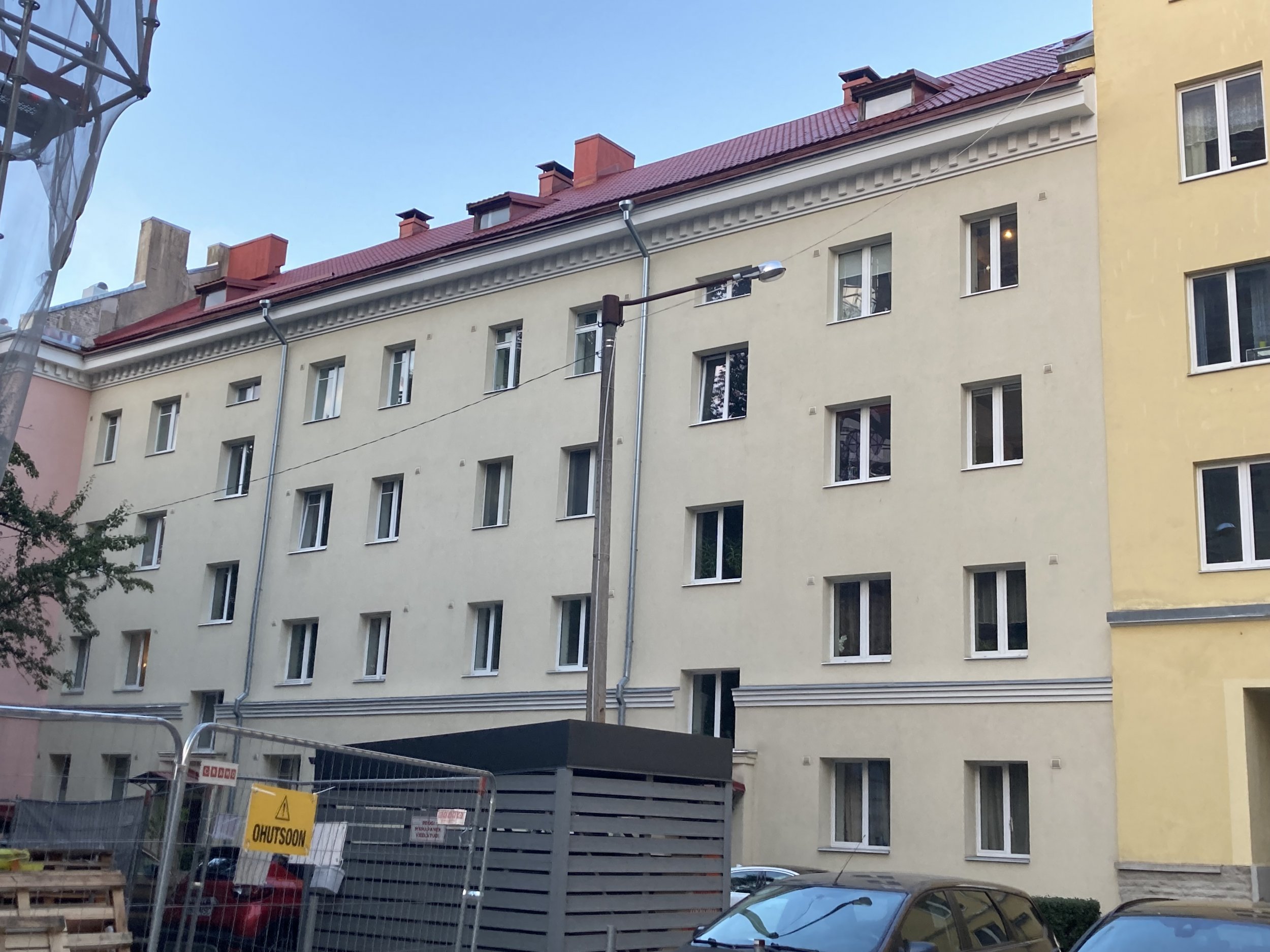 Tallinnas, Kesklinnas asuv 4-korruseline, kahe trepikojaga korterelamu, majal on viilkatus/plekk (kalle ca 30º, pikkus ca 30m).