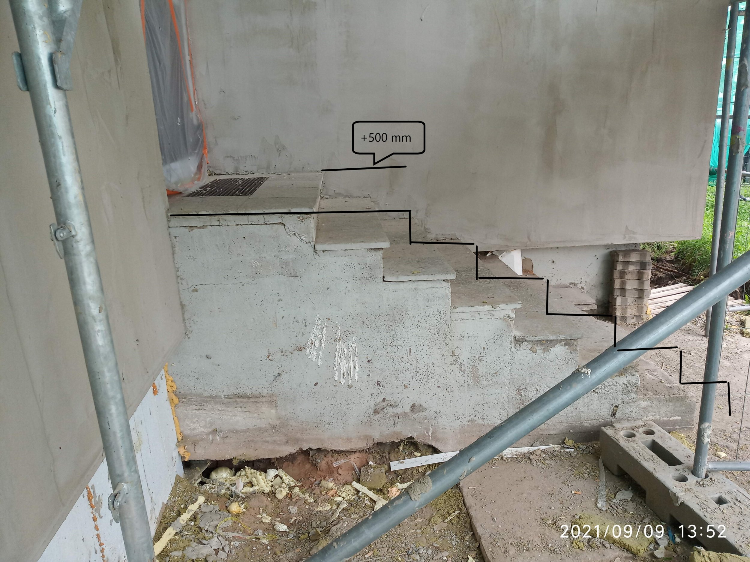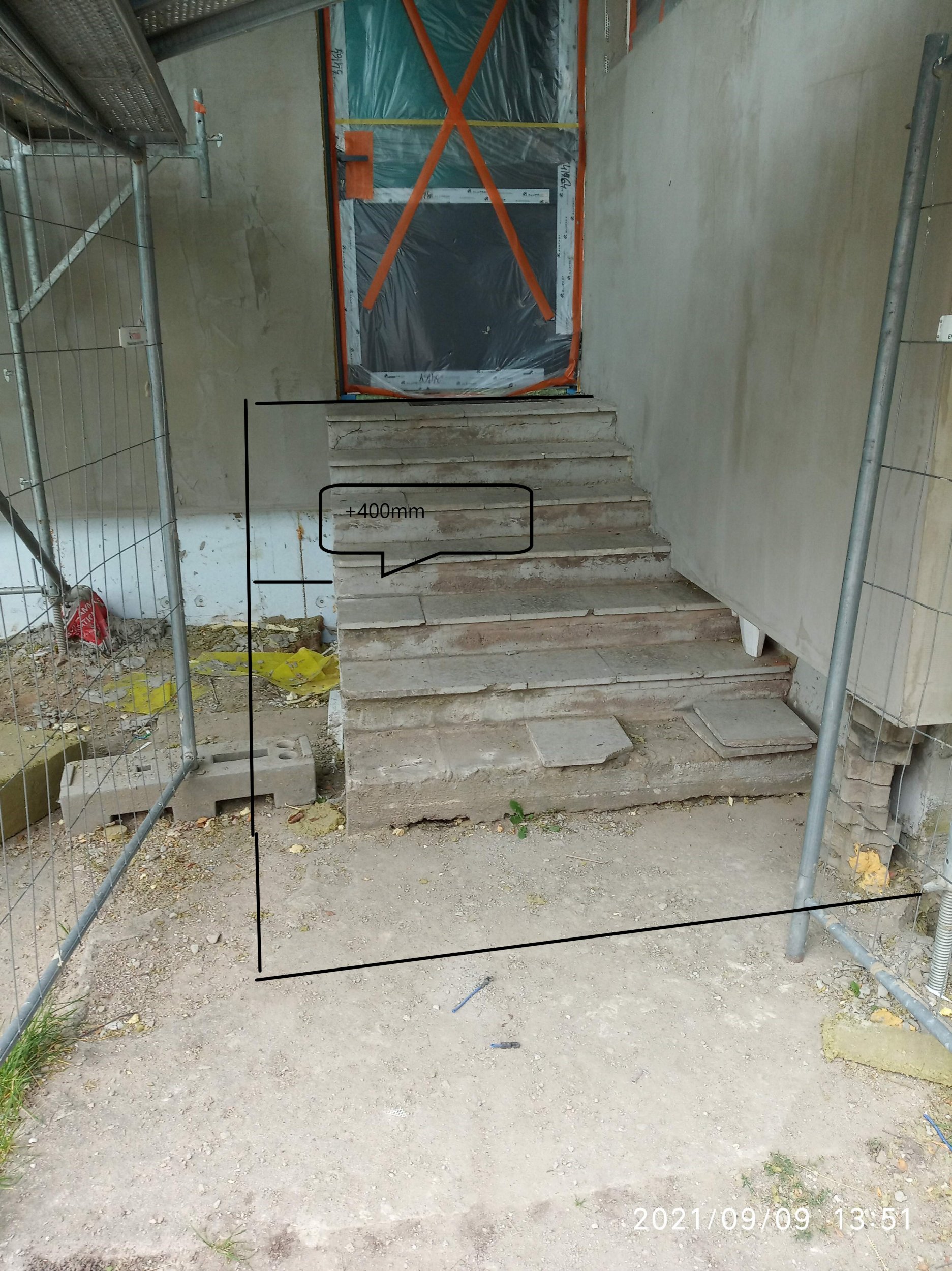 Olemasolev trepp tuleb rekonstrueerida. Hetkel 1300 mm laiale trepi peab tegema laienduse nii, et kogulaius tuleks 1700 mm ( +400 mm olemasolevaga). Trepi pealmine made tuleb pikendada +500 mm võrreldes olemasolevaga ( hetkel 700 mm, vajadus 1200 mm järele). Seejärel sama sammuga trepiastmed ( 300 mm laius x 6 tk) vormistada saalungiga ja betoneerida. Töö peab sisaldama ka armeeringut.