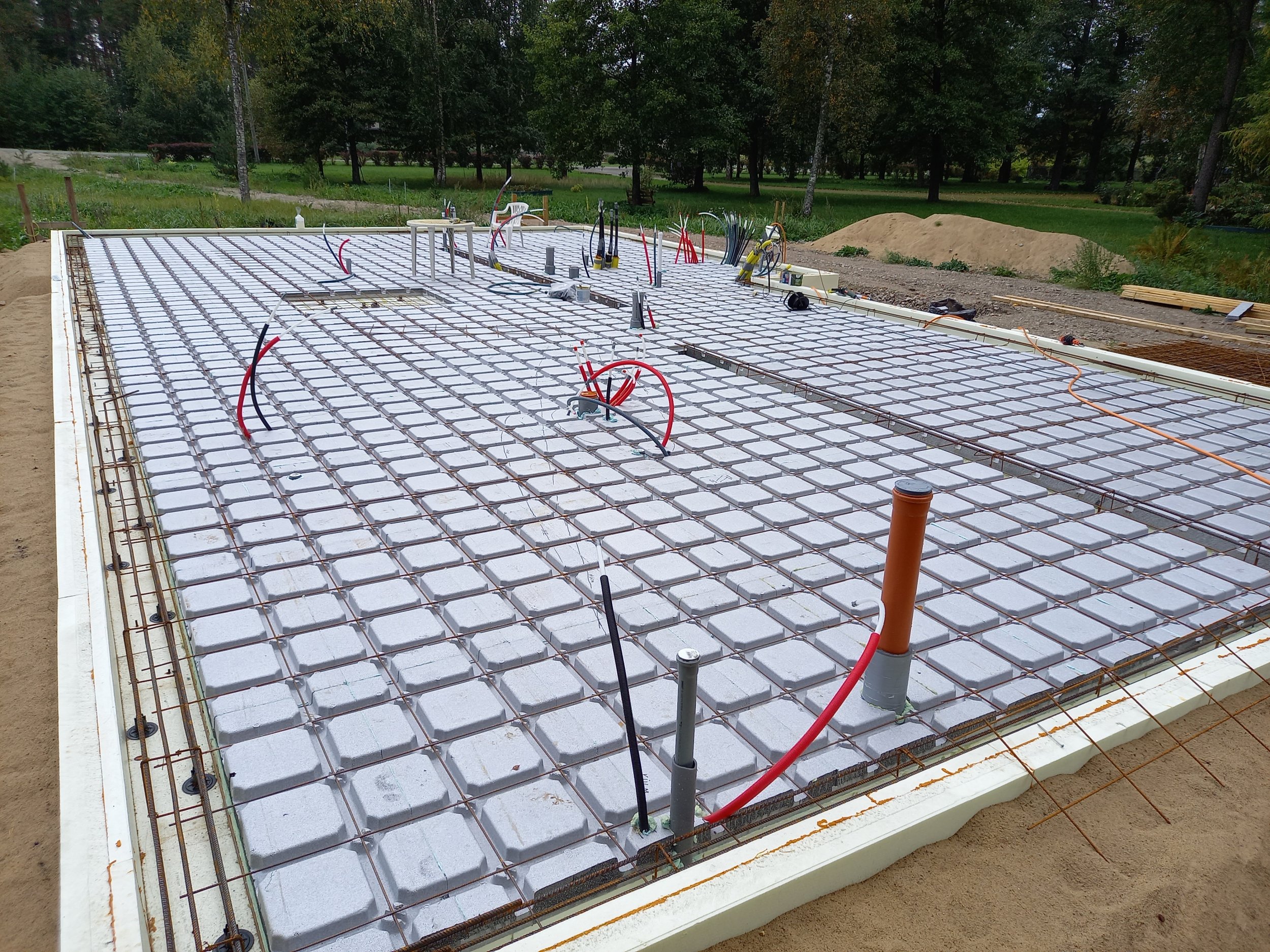 Tegemist on valmiva plaatvundamendiga. tarbevesi, kanalisatsioon on paigaldatud n.ö alumistesse kihtidesse. Joonisel sinisega on näidatud plaatvundamendi kandvate siseseinte alused vundamendid. St. selles kohas on vundament n.ö sügav. Võimalusel tuleks vältida toru läbiminekut (võis siis jämedas kõris). Põranda valu/toru all on kokku 30 cm soojustust, toru/valu alune kiht on Finfoam EPS-FFfloor : https://www.finnfoam.com/products/ff-floor, ehk siis toru kinnitub EPS-FFfloor plaadile mitte armatuuri külge nagu tavapäraselt.