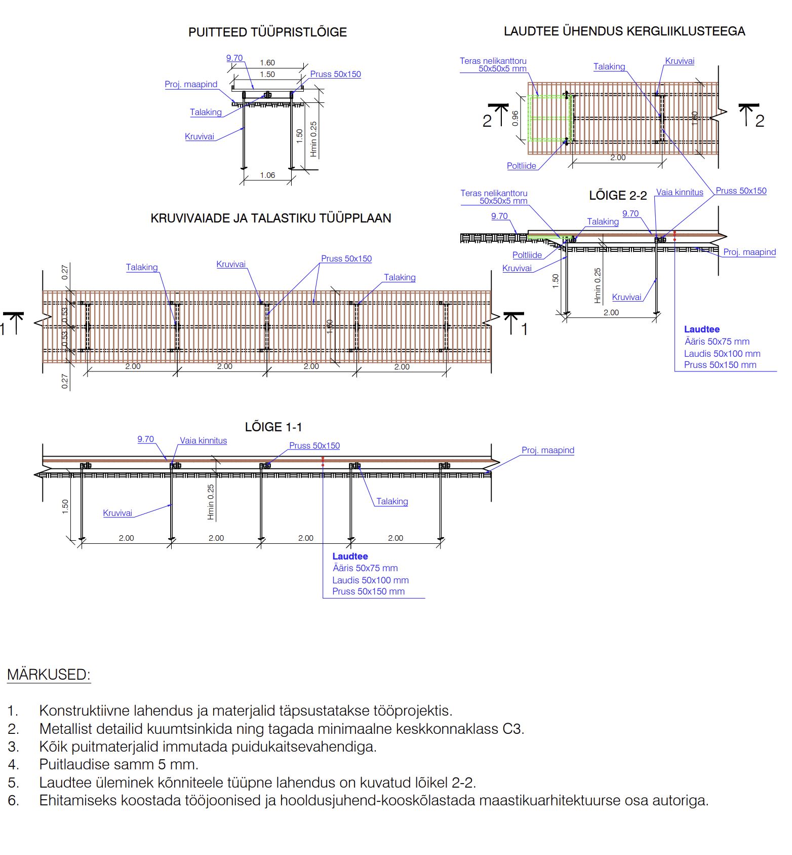 Metallist üleminek (vt joonist) tuleb teha. Kruvivaiad võib asendada betoonist postidega. Kinnitused C3 klassist või roostevabad. Terrassi pealmine pind sile (hööveldatud või peensaetud).